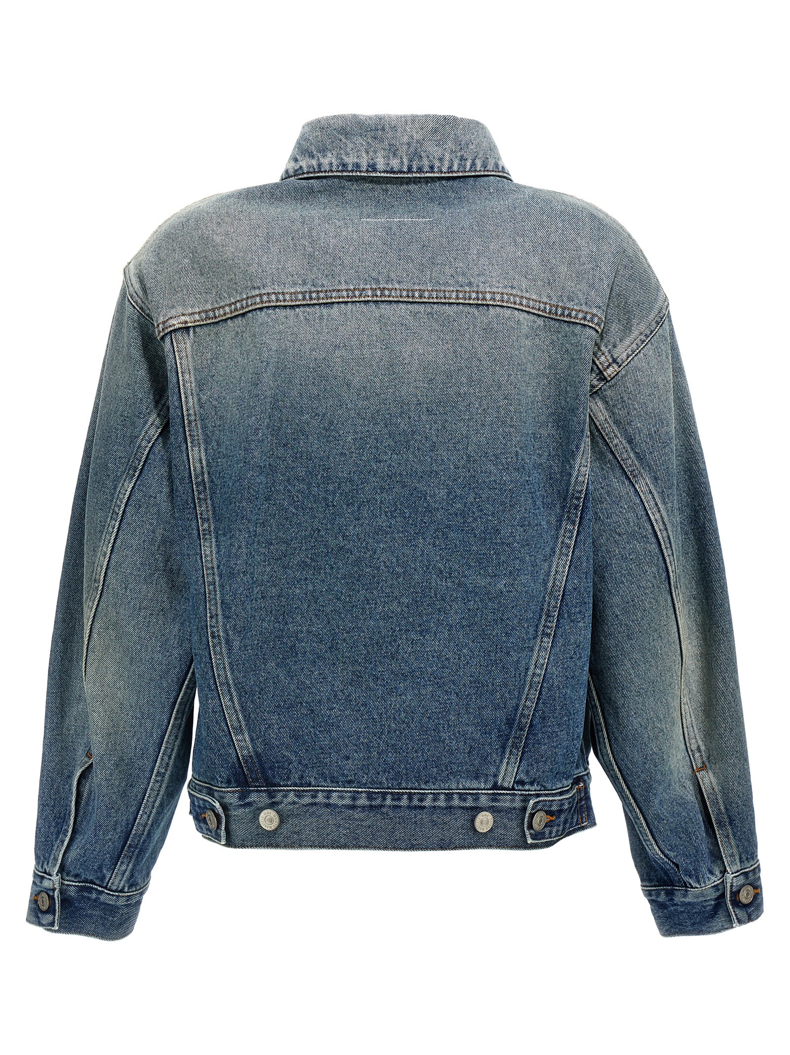 Cotton denim jacket with cut-out details around the sleeve, button closure, pockets, long cuffed sleeves, 'White stitch line' at the back. This product is made with craft techniques, possible variations between one item and another are to be considered characteristics of the product.