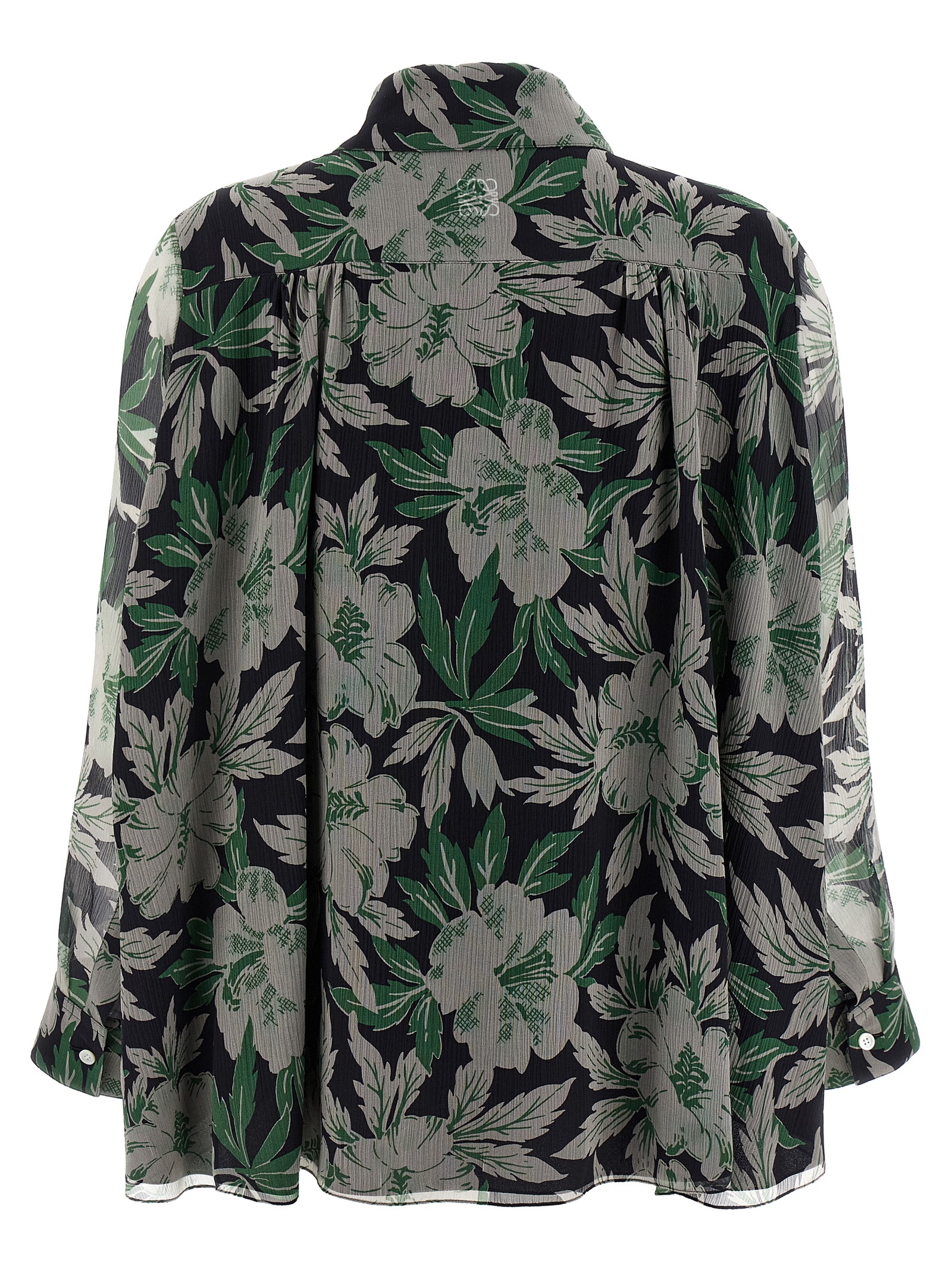 Light embossed silk shirt with all-over Hibiscus floral print, trapeze silhouette, half-lined, front button closure, crop style with asymmetric hem, long cuffed sleeves.Өнімнің ерекшеліктері