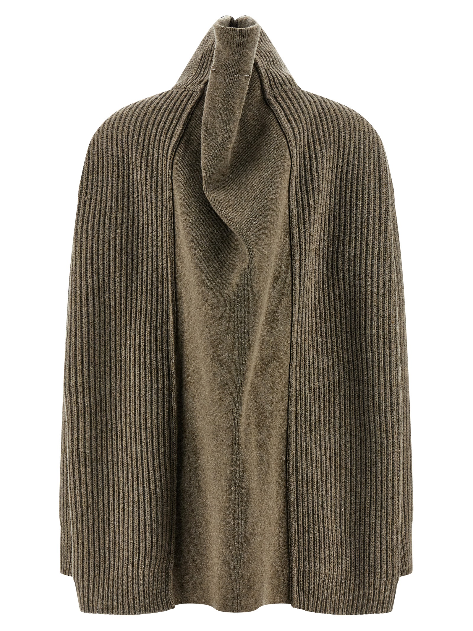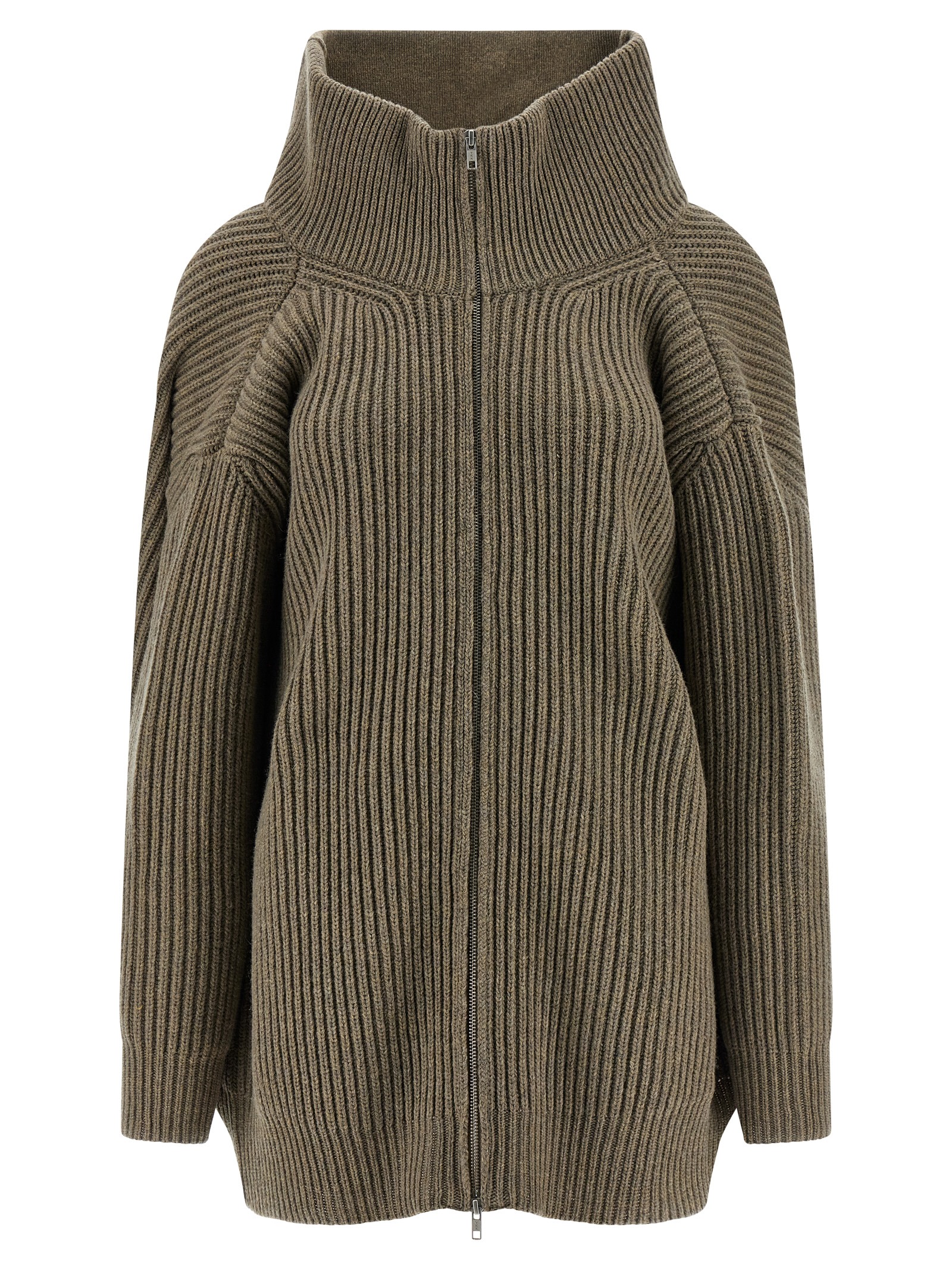 Ribbed wool knit cardigan, high neck, front zip closure, long sleeves with cuffs and dropped shoulder, tone-on-tone stretch knit back panel to adjust the width, 'White stitch line' at the back.