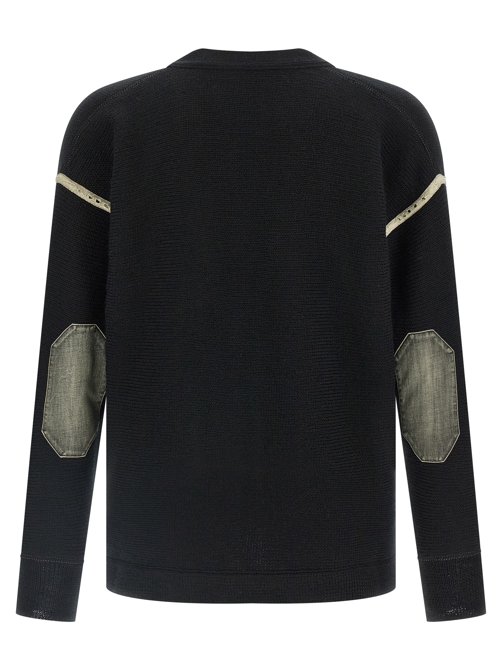 Virgin wool cardigan with V-neck, front button closure, long cuffed sleeves, dropped shoulder, contrasting used-effect cotton detail, and stonewashed cotton denim elbow patch. This product has been made with craftsmanship that makes it a unique piece. Slight imperfections and slight differences between one garment and another are, therefore, to be considered normal and a guarantee of craftsmanship of the product.