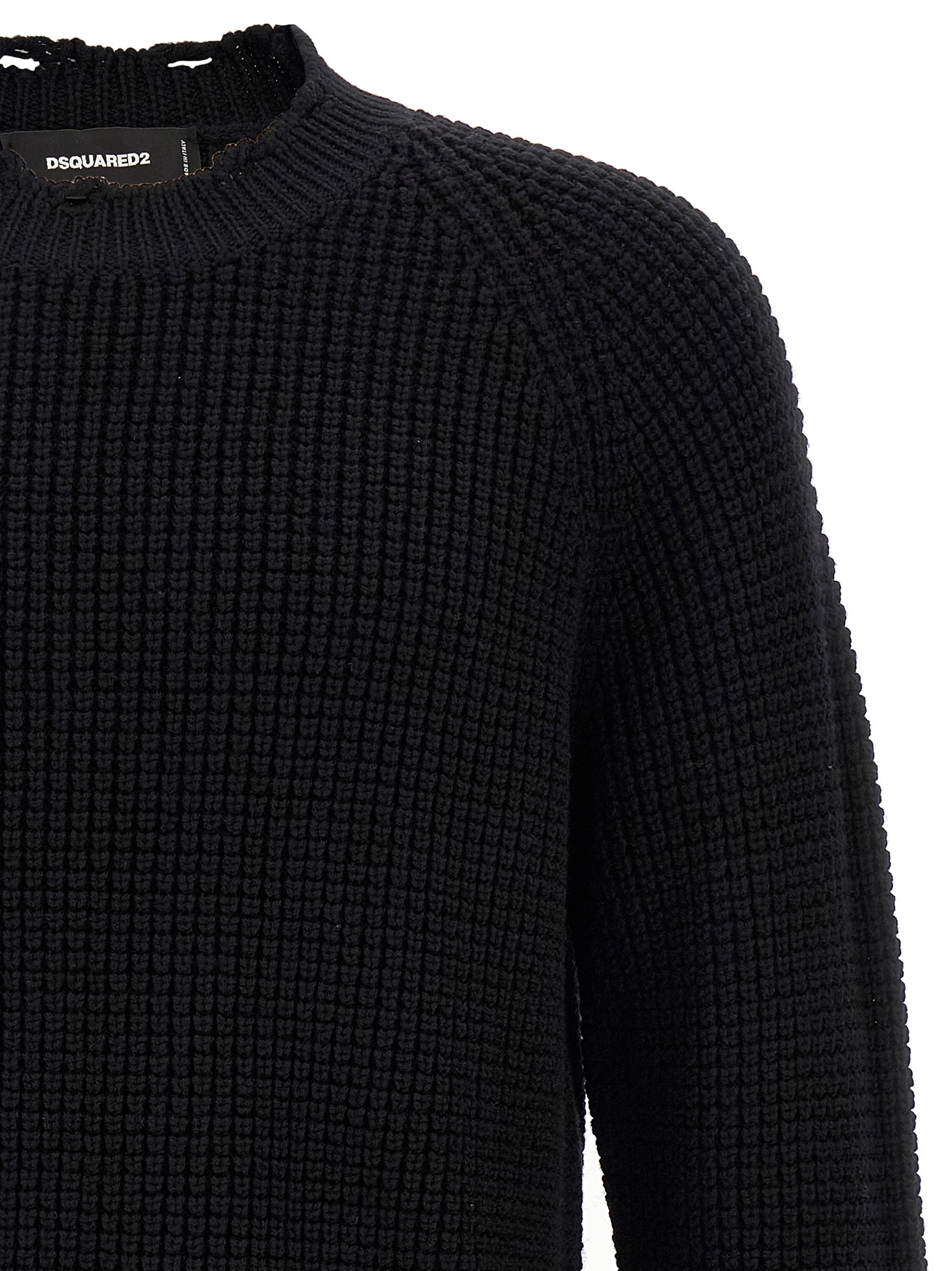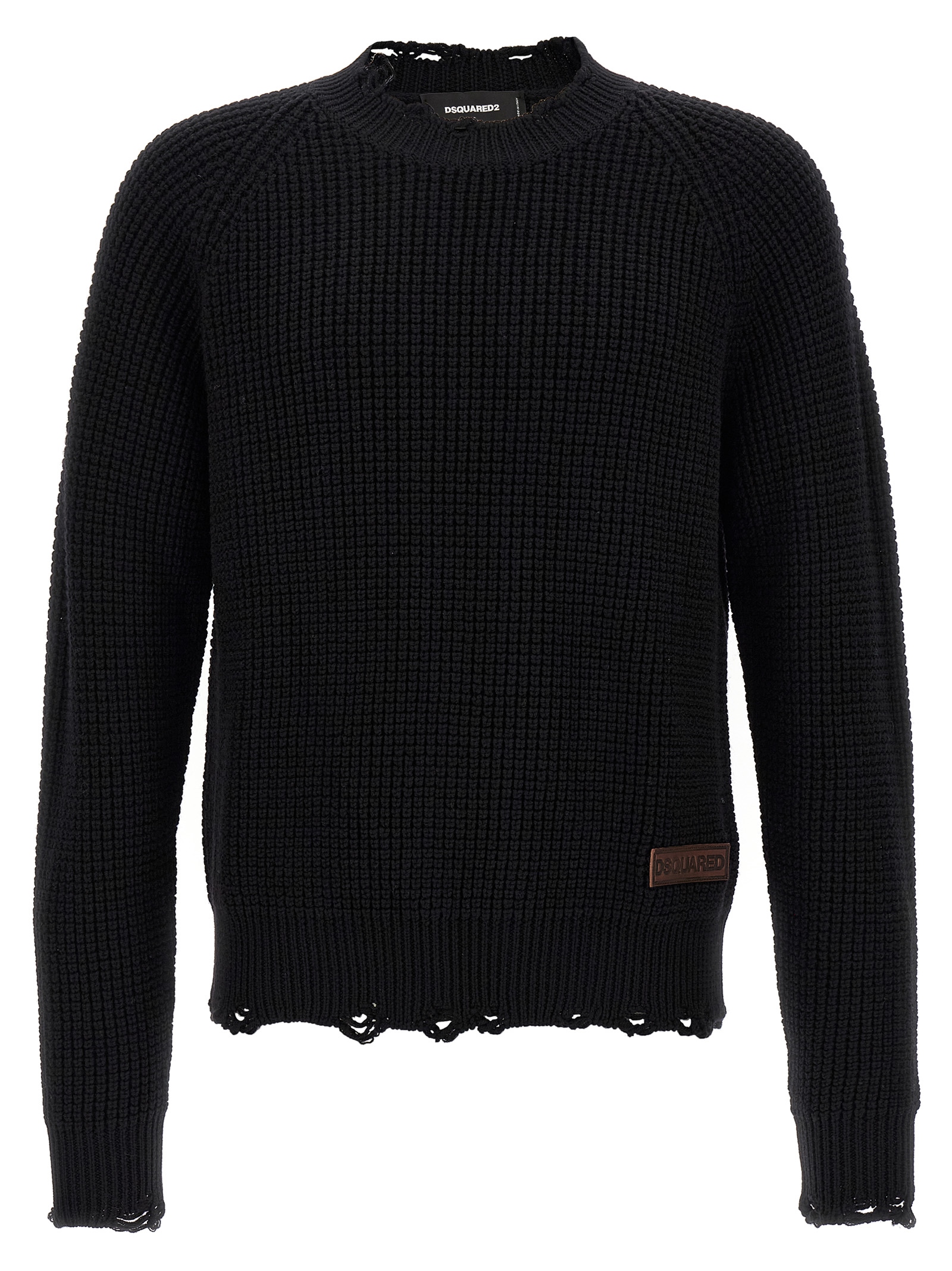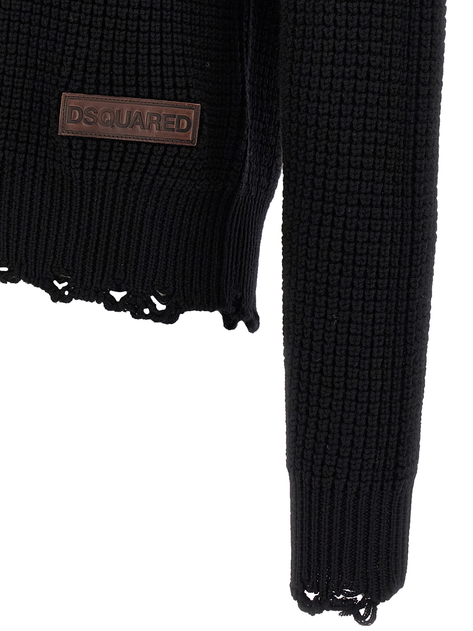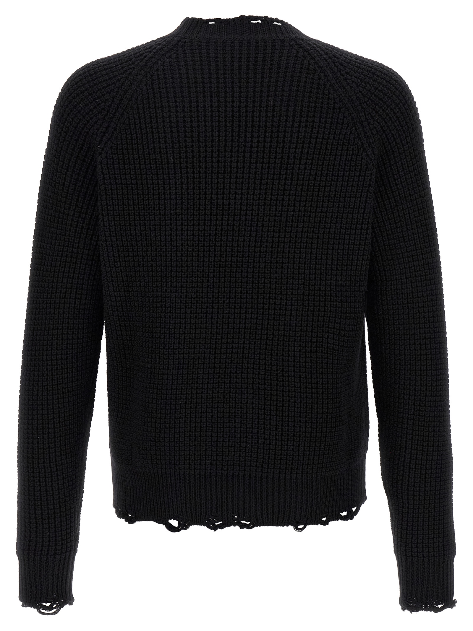 Wool crewneck sweater with side logo patch, 'destroyed' details on the hem and cuffs, long sleeves.