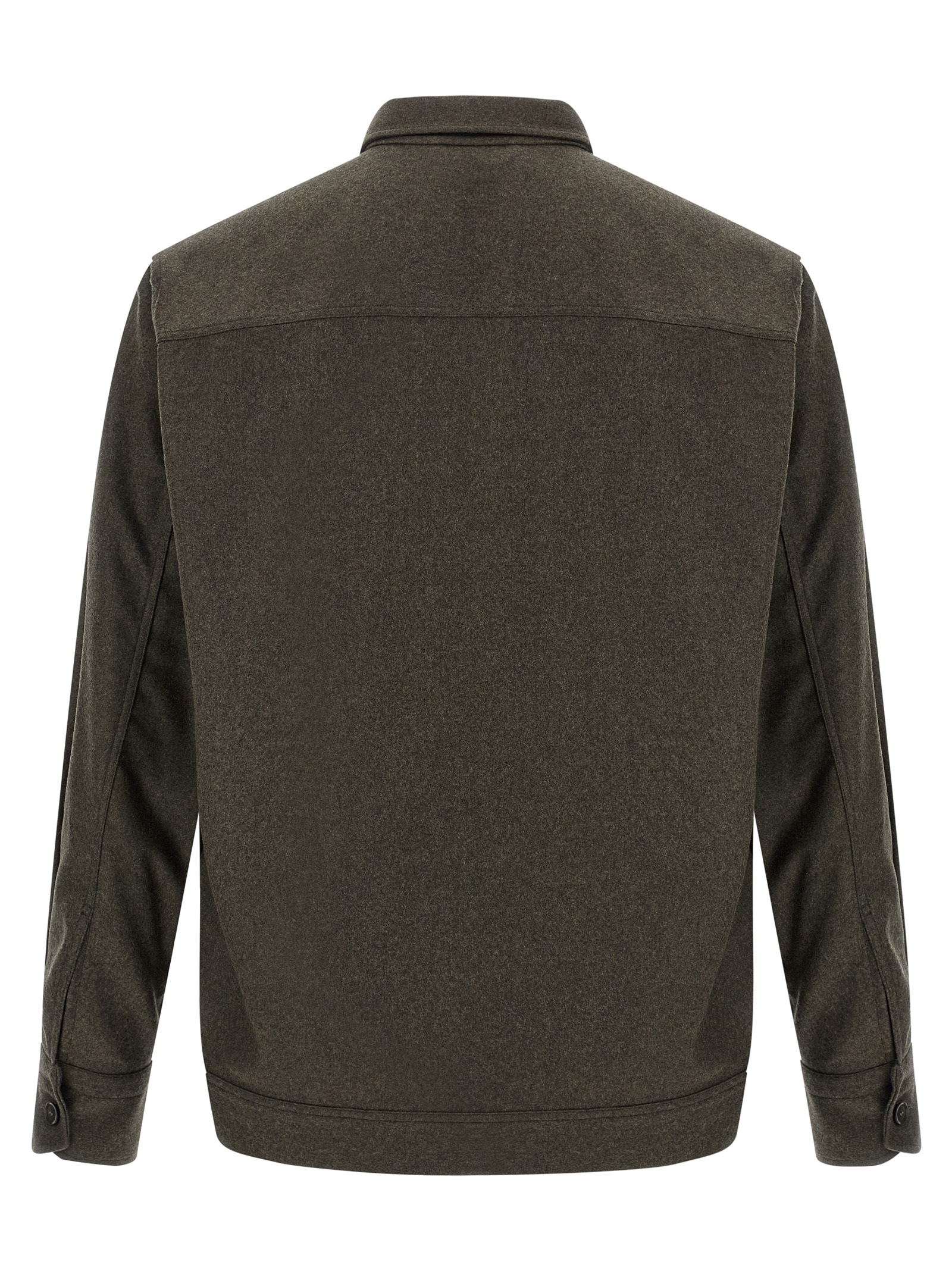 Wool cloth overshirt with front button closure, pockets, long cuffed sleeves, unlined.