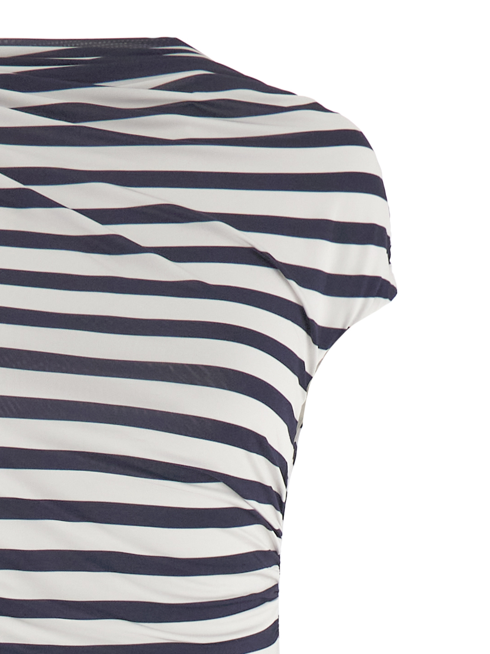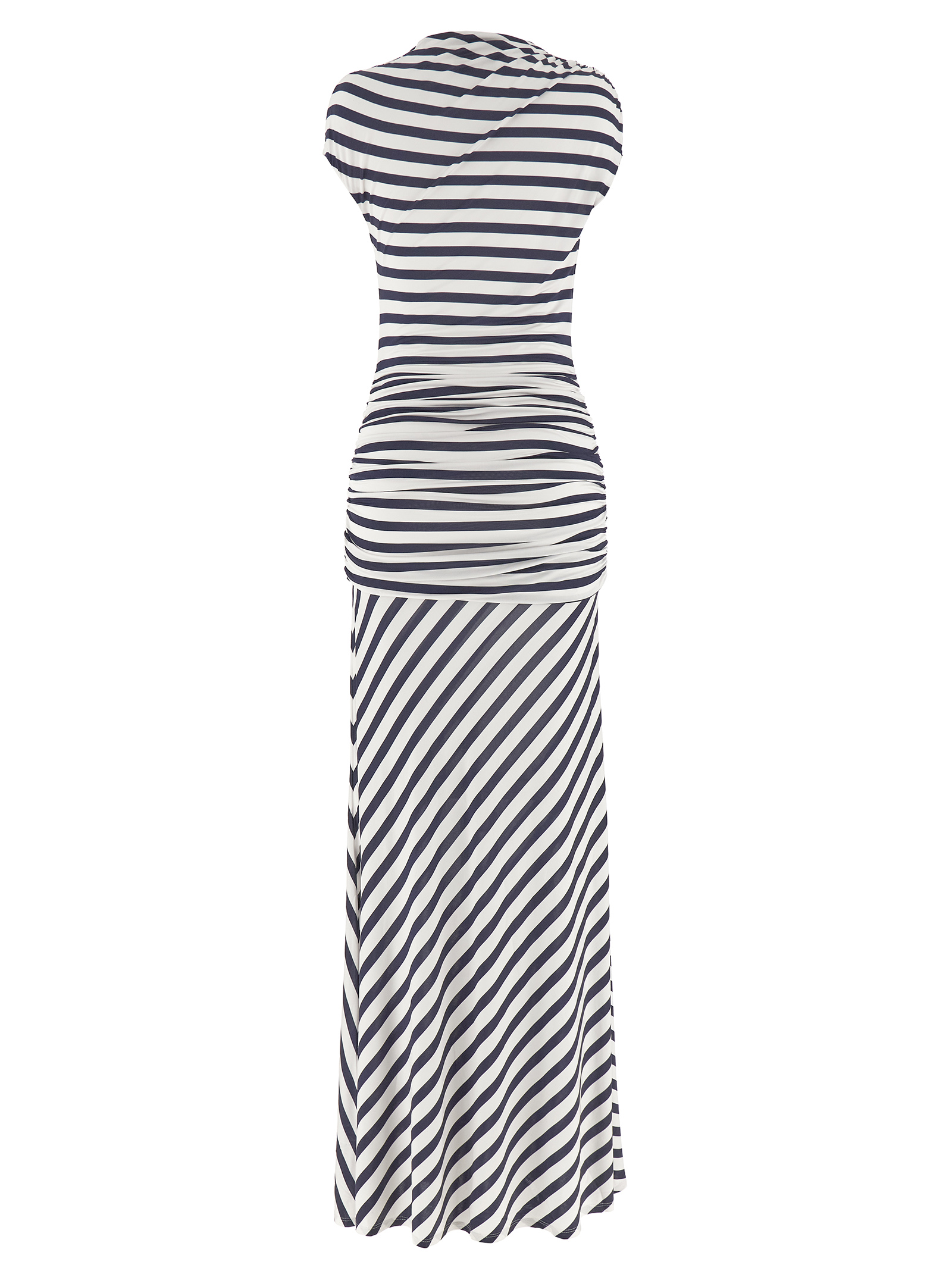 «Төк түсті жолақты жейде макси» жолақты жылтыр созылған вискозадан жасалған жейде көйлегі, белі кең алдыңғы және артқы жағымен жабылған, су перісі бейнеленген юбка, қысқа жеңді, биік жағалы.Тауар сипаттамалары