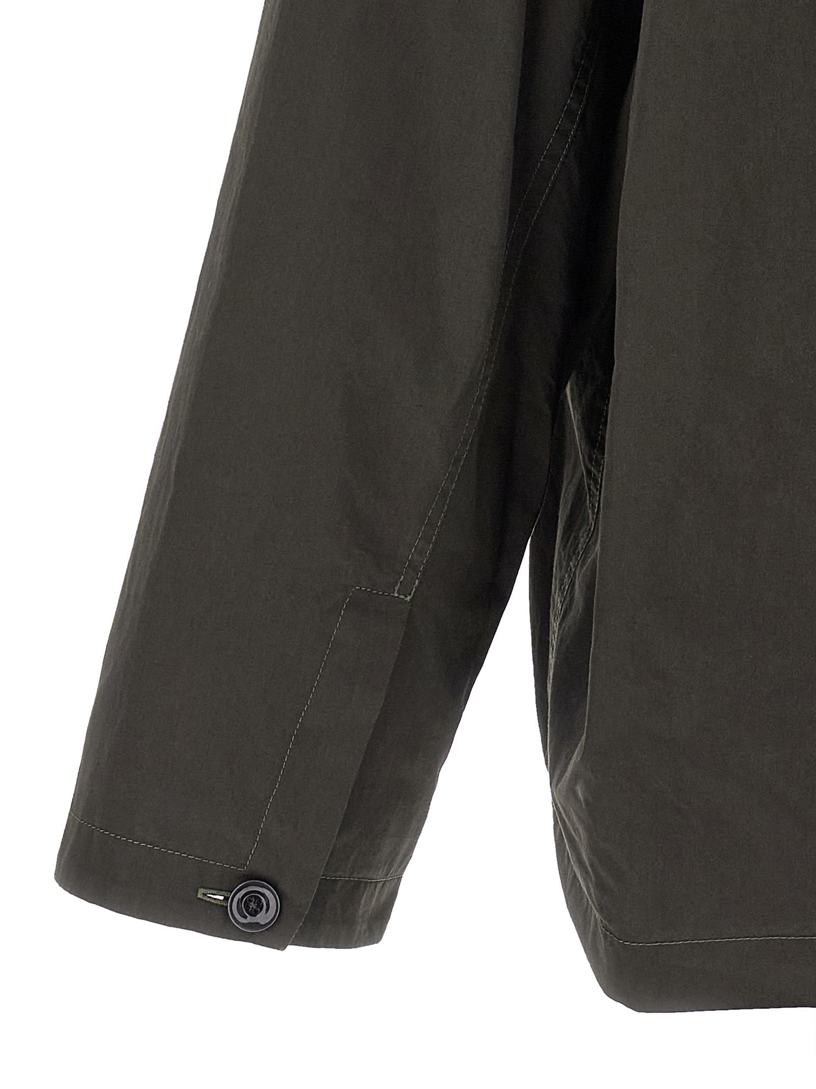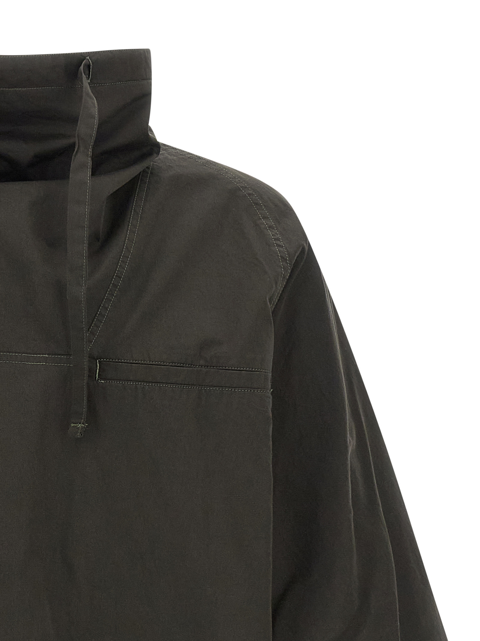 'Funnel Neck Vareuse' sweater with plywood cotton hood lined in jersey, adjustable drawstring neckline, long sleeves with buttons.