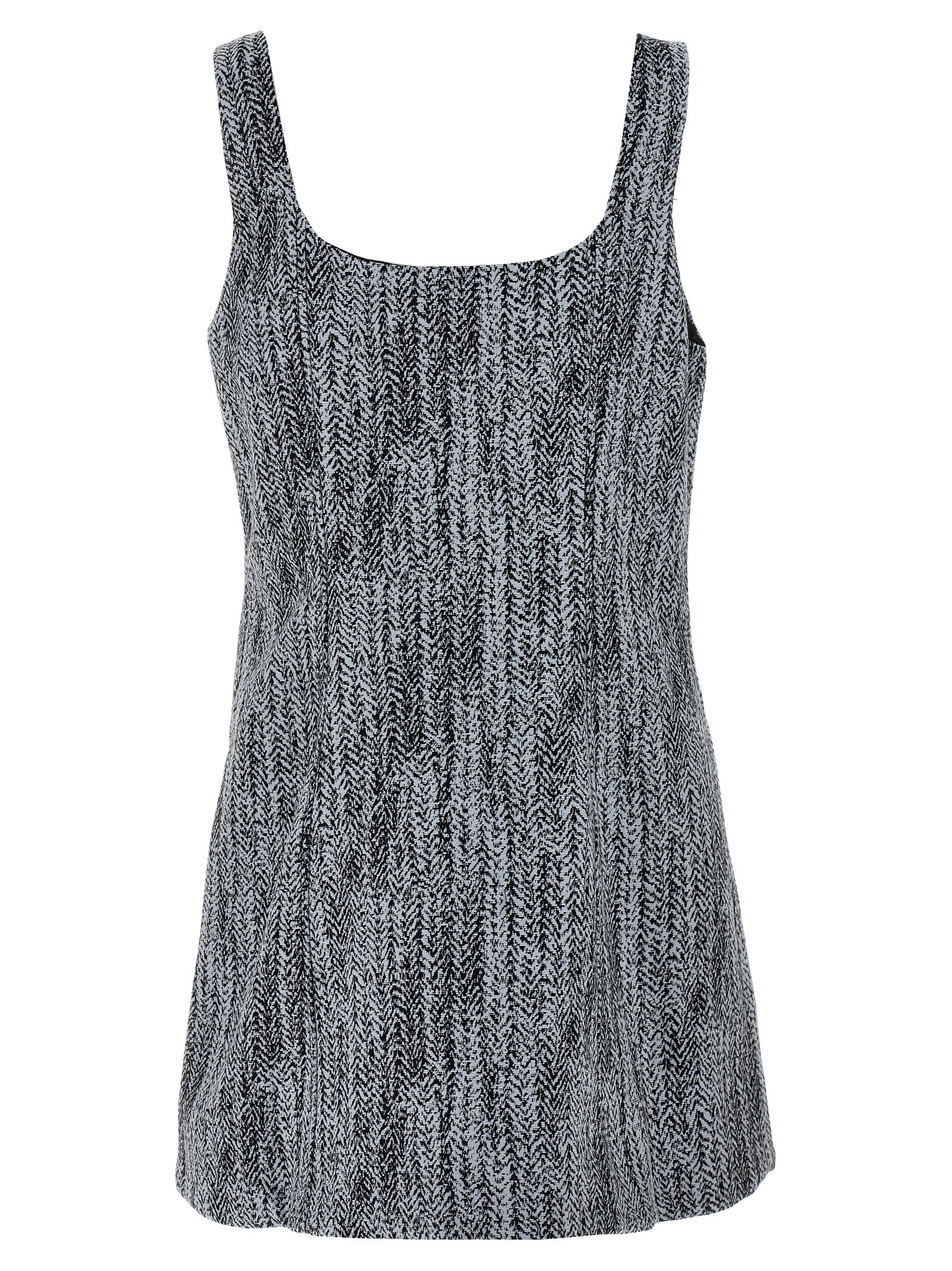Cotton tweed mini dress with square neckline, snap button closure, pockets, lining.