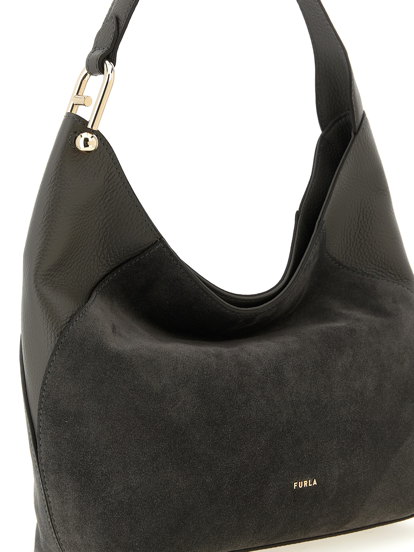 'Furla Lara' medium shoulder bag in suede and smooth tone-on-tone calf leather, front metal lettering logo, magnetic closure, fixed handle with iconic Arco logo with metal ball element.