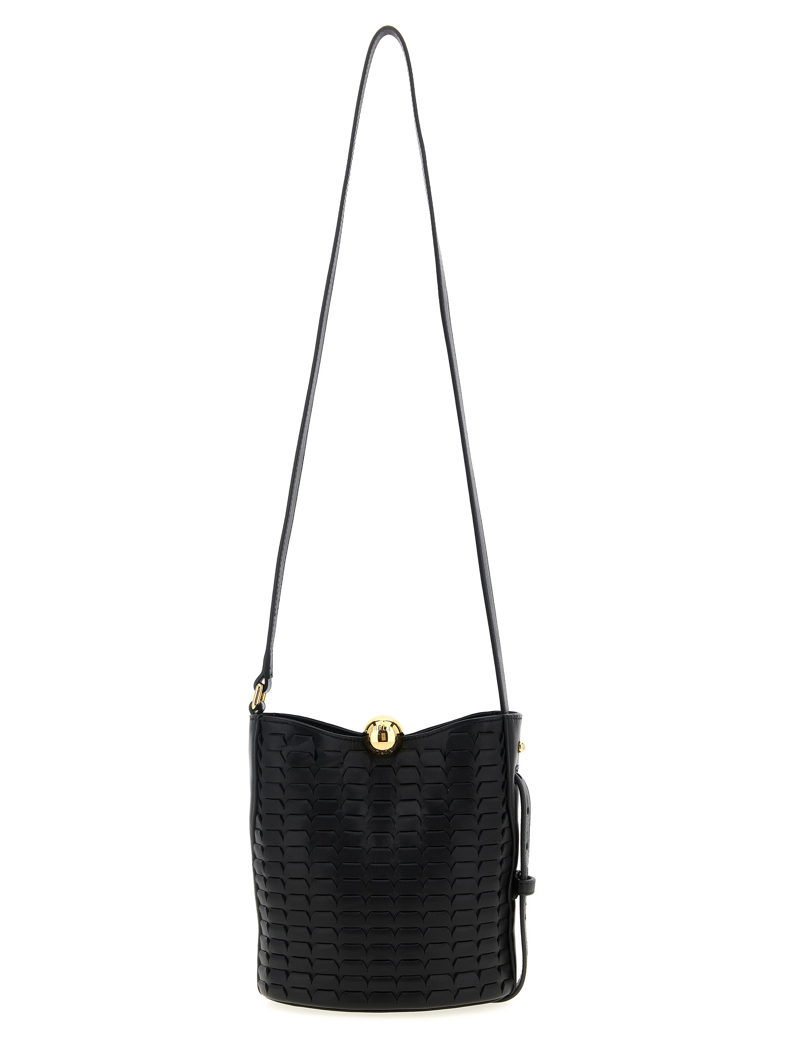 'Furla Sfera Soft' mini leather bucket bag with braided front, magnetic closure with ball hardware, back embossed logo, adjustable shoulder strap.