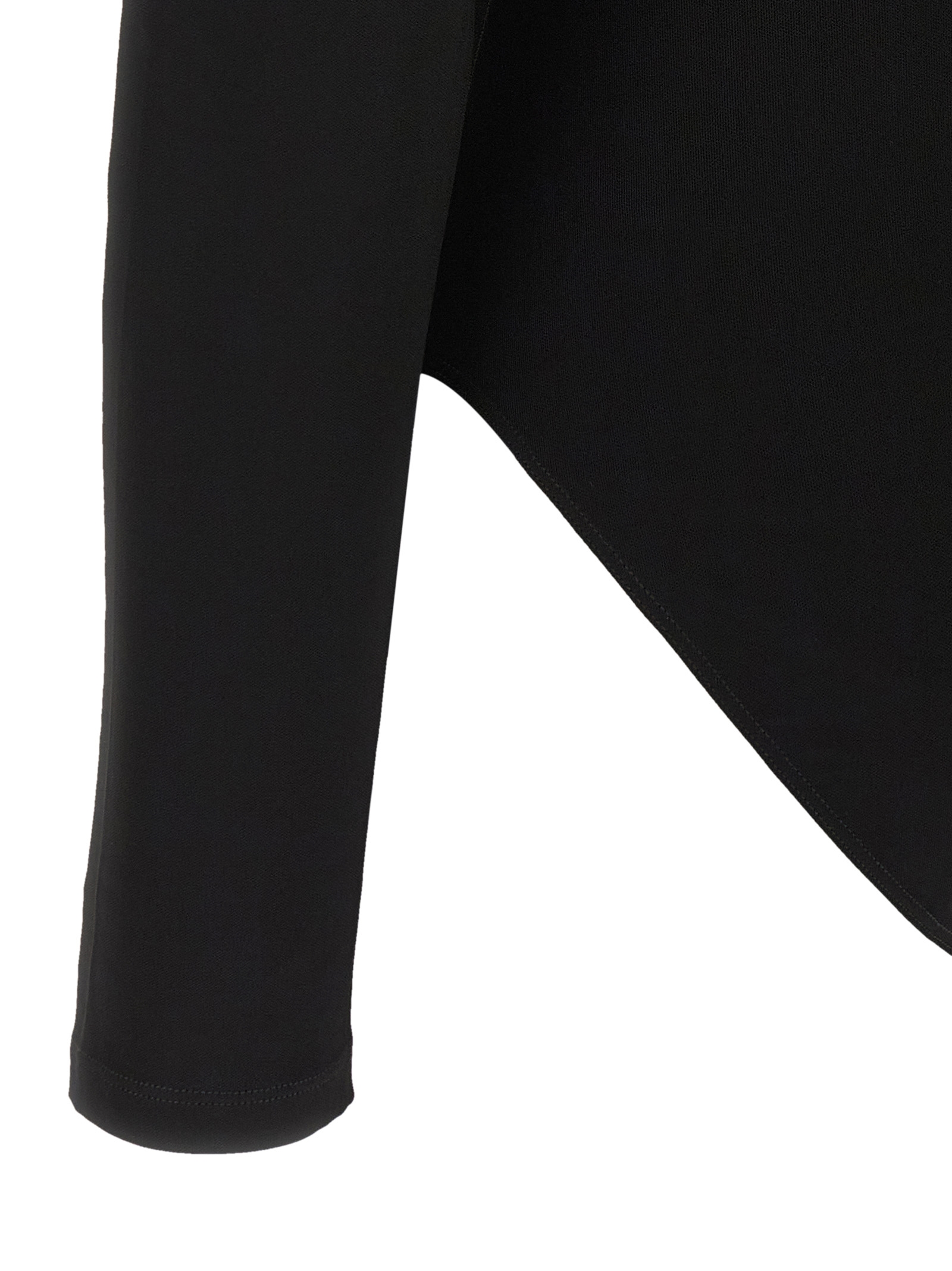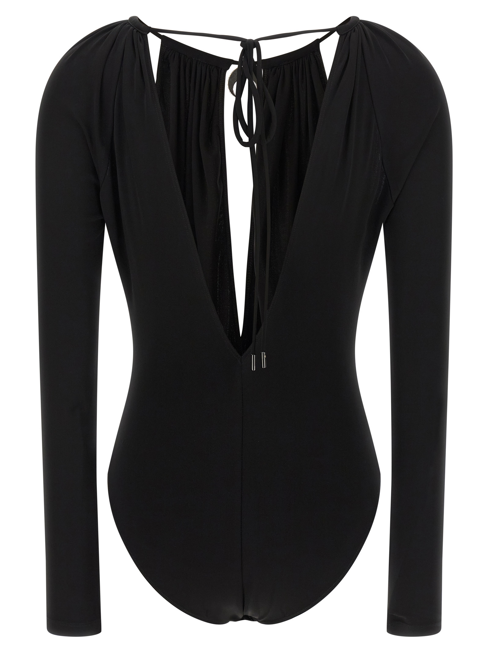 Stretch viscose bodysuit with large cut-out details on the front and back, tie at the back of the neck with jewel pendant on the front, long sleeves, snap buttons on the hem.