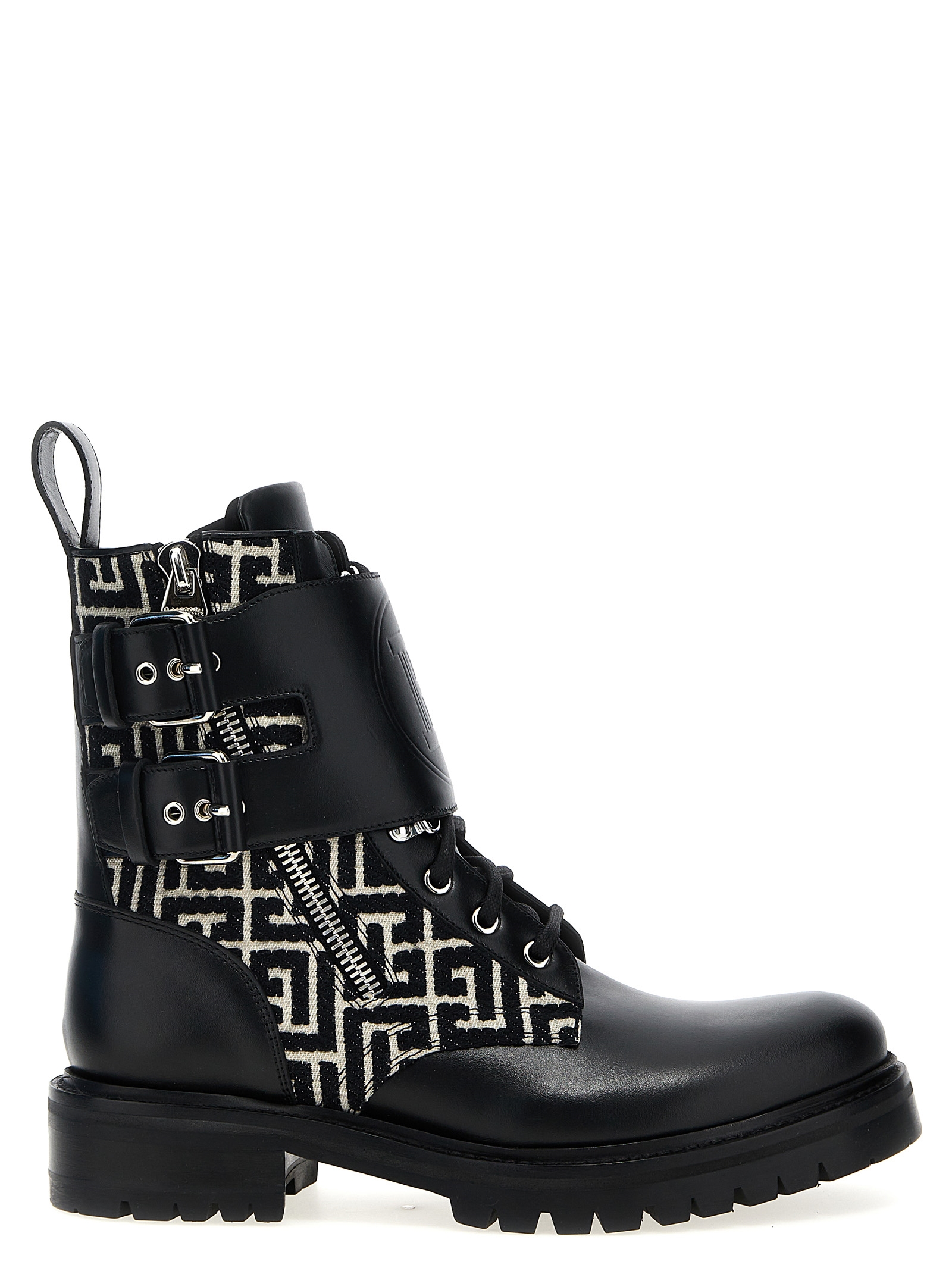 'Ranger' leather and jacquard fabric ankle boots, lace-up closure, side zip, adjustable straps with embossed logo, rubber sole.