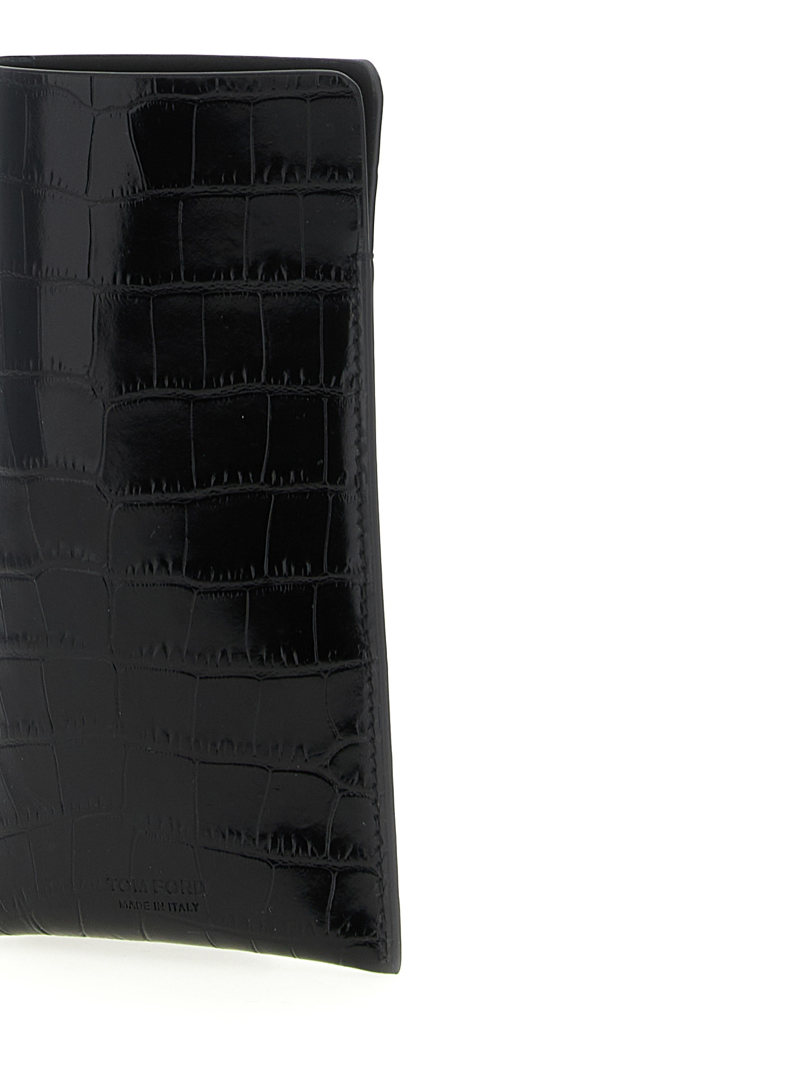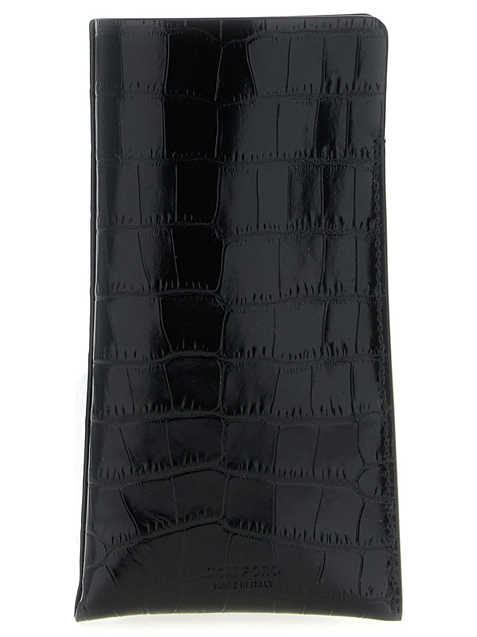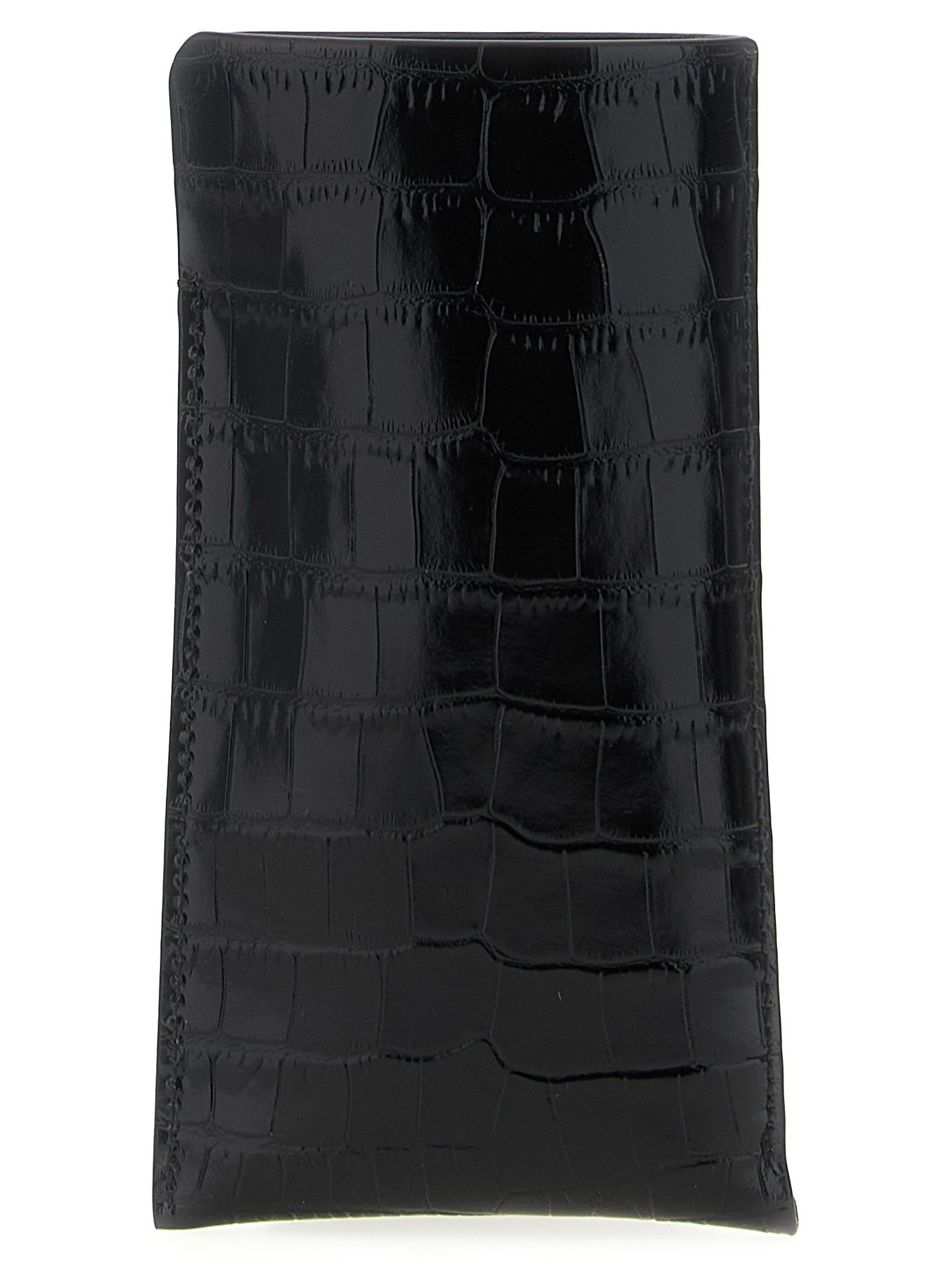 Glasses case in shiny crocodile print leather with front embossed logo.