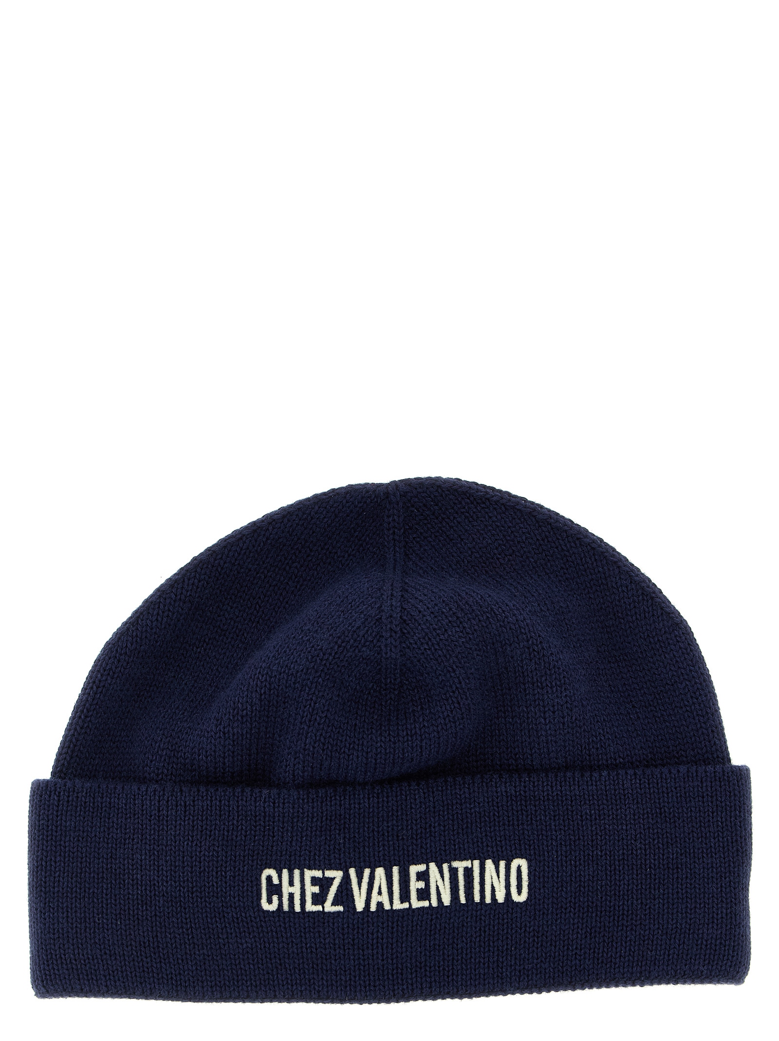 Knitted virgin wool beanie with contrast 'Chez Valentino' embroidery on the front.