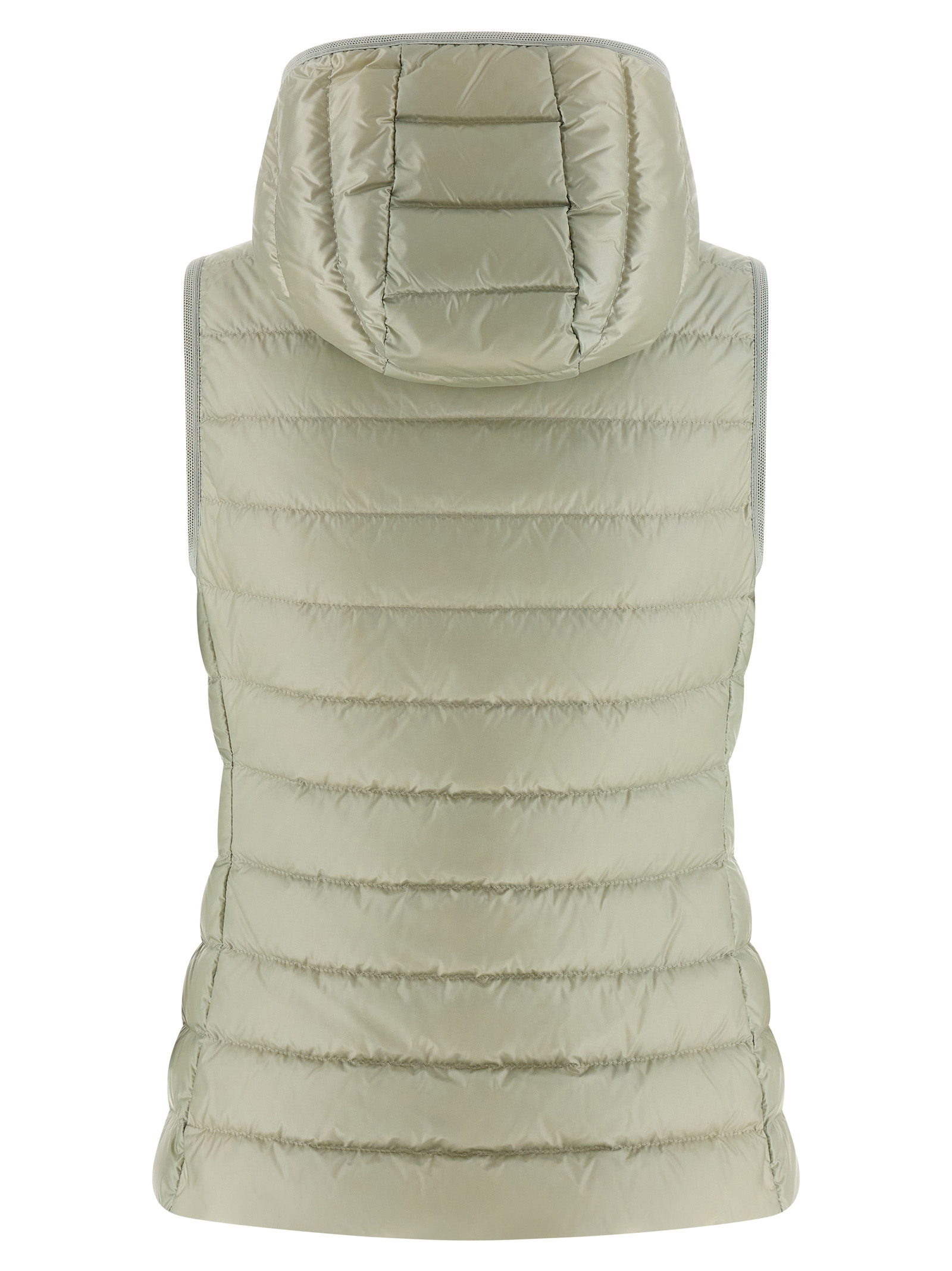 'Glygosse' quilted and goose feather padded vest in saison longue, hood, high neck, felt logo patch and front zip closure, pockets.