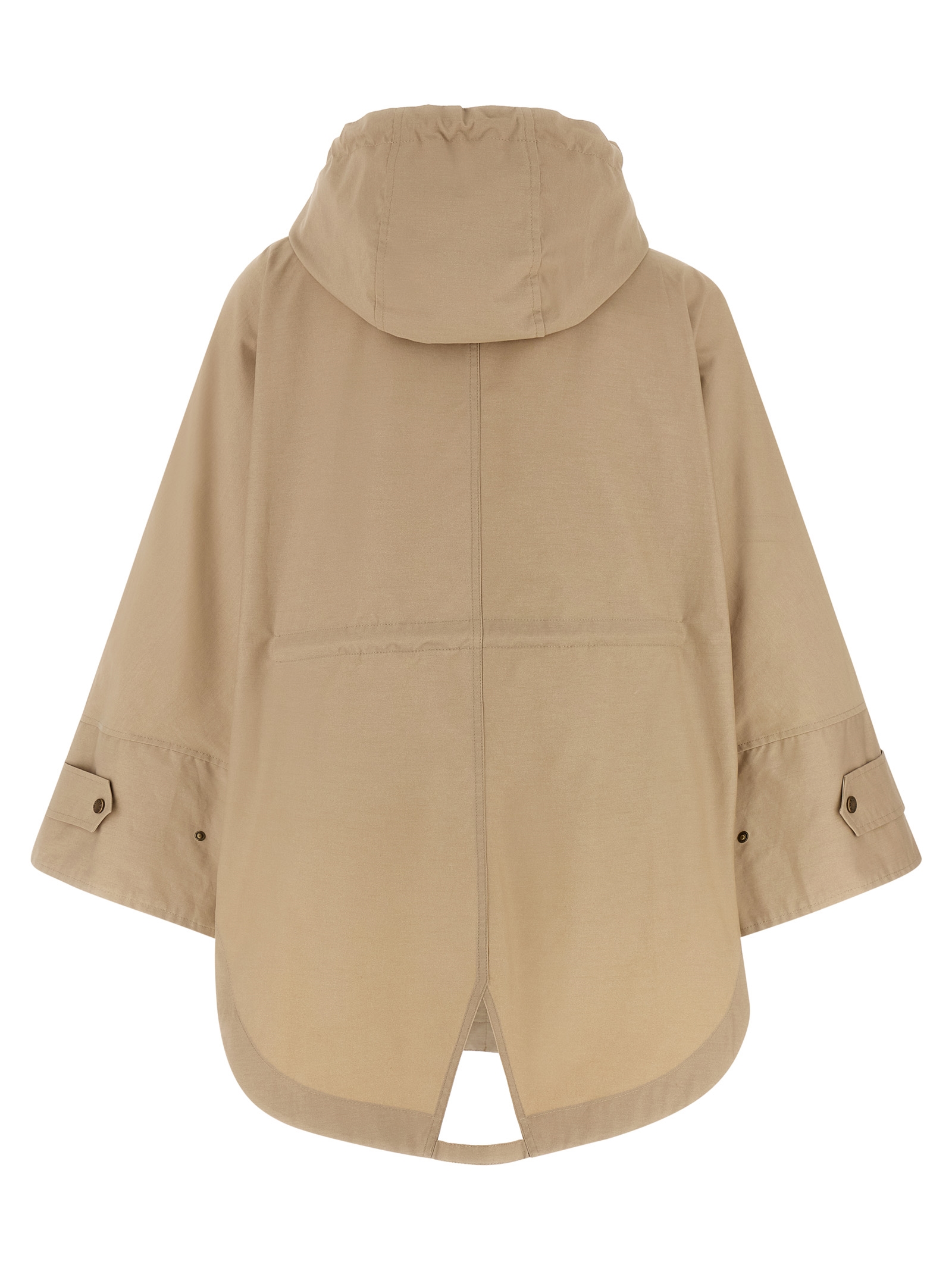 'Brunnera' cotton parka with water repellent treatment, adjustable hood, high neck, zip closure and front snap buttons, long wide bat sleeves with adjustable cuffs and felt logo patch, drawstring at the waist, rounded hem with back cut-out, unlined.