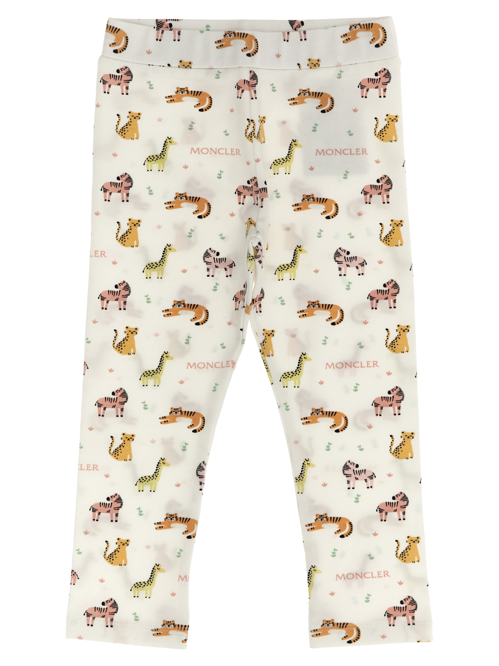 Stretch cotton jersey set consisting of crewneck t-shirt, front felt logo patch, back snap buttons, short sleeves, ruffles and animal print leggings with elastic waistband.