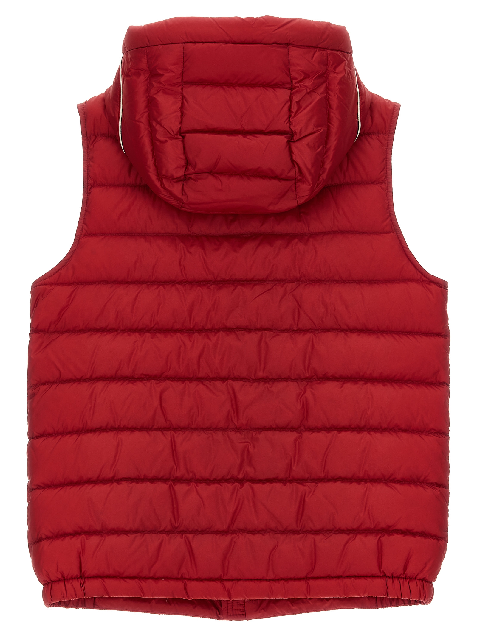 'Uzzay' vest in quilted and goose feather padded saison longue, hood with tricolor trim, felt logo patch and front zip closure, high neck, pockets, elastic on the hem.