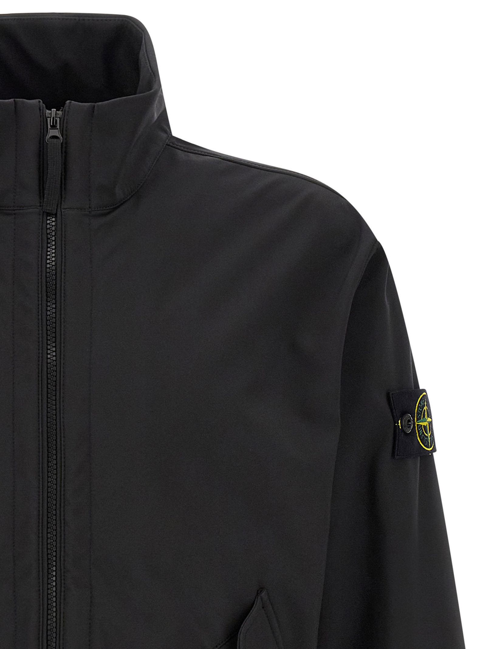 '4100022' jacket in three-layer technical material with 8000 mm water column with outer part in stretch polyester canvas woven with e.dye® Waterless Color System™ technology yarns and inner part in textured polyester jersey with breathable and water and wind resistant membrane, high neck, front zip closure, pockets, long sleeves with elastic cuffs and logo badge appliqué, Back elastic band on the hem.