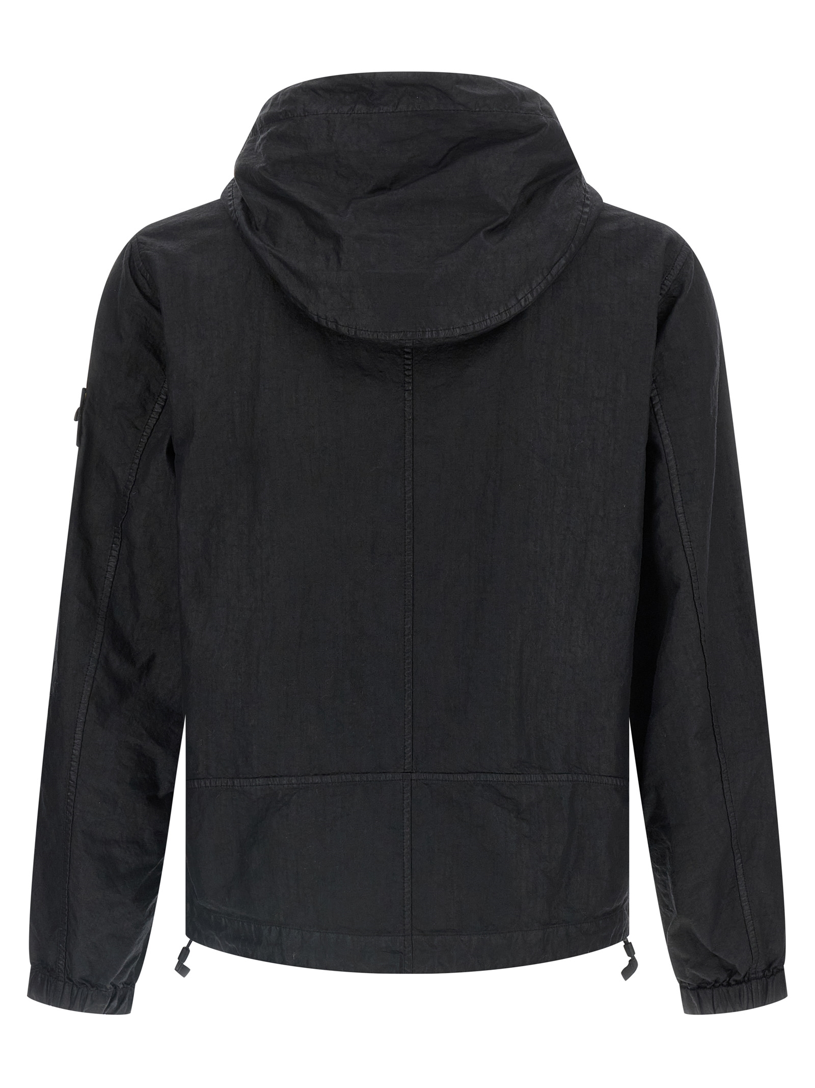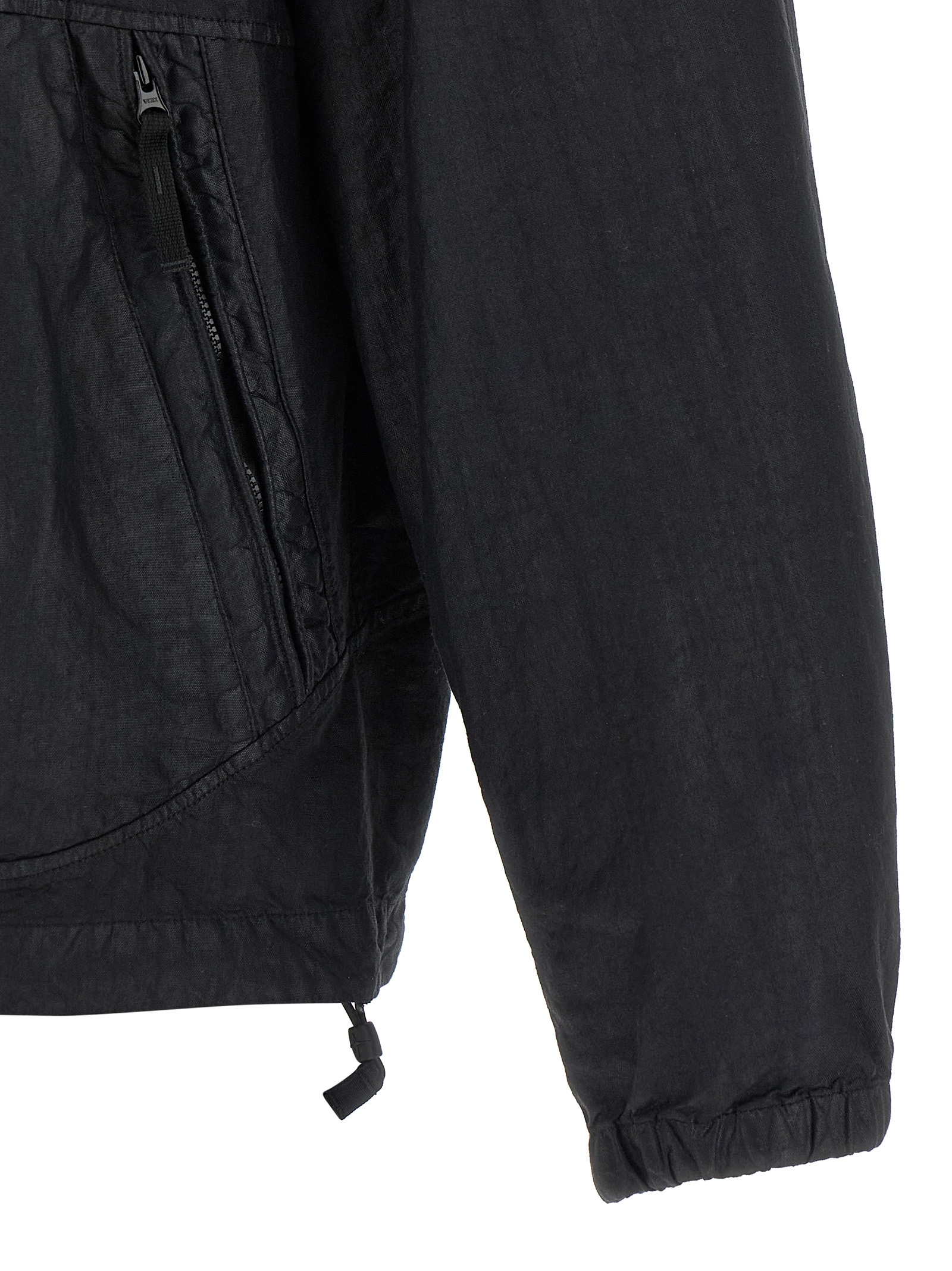 '4100053' jacket in Panama woven calendered fabric with anti-drip agent and garment dyeing process that gives the fabric surface a marbled appearance, adjustable lined hood, high neck, front zip closure, pockets, long sleeves with elastic cuffs and logo badge appliqué, drawstring on the hem, unlined. Panama woven calendered fabric is an innovative 100% nylon Made in Japan fabric with a sensational natural look. The very thin nylon extrusions are cut, mixed, blown, carded, twisted and spun to imitate natural fibers.Характеристики товара
