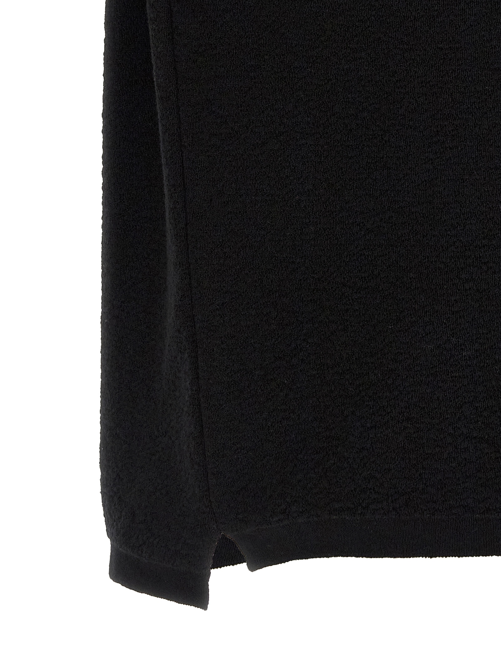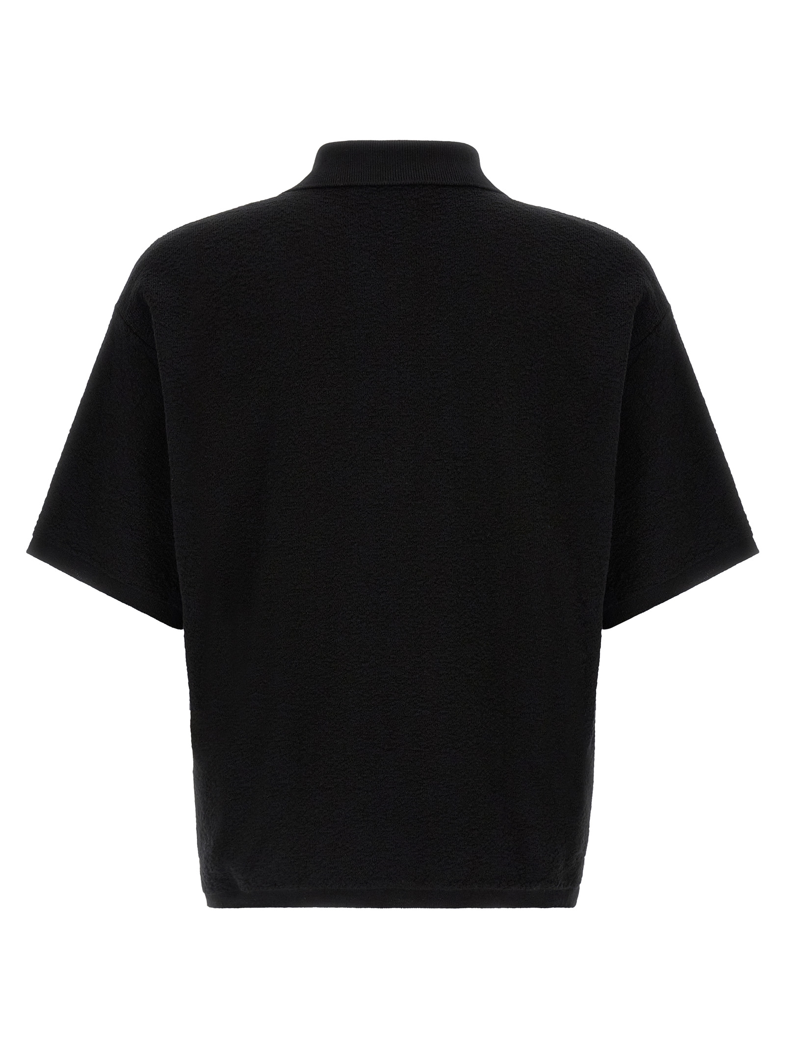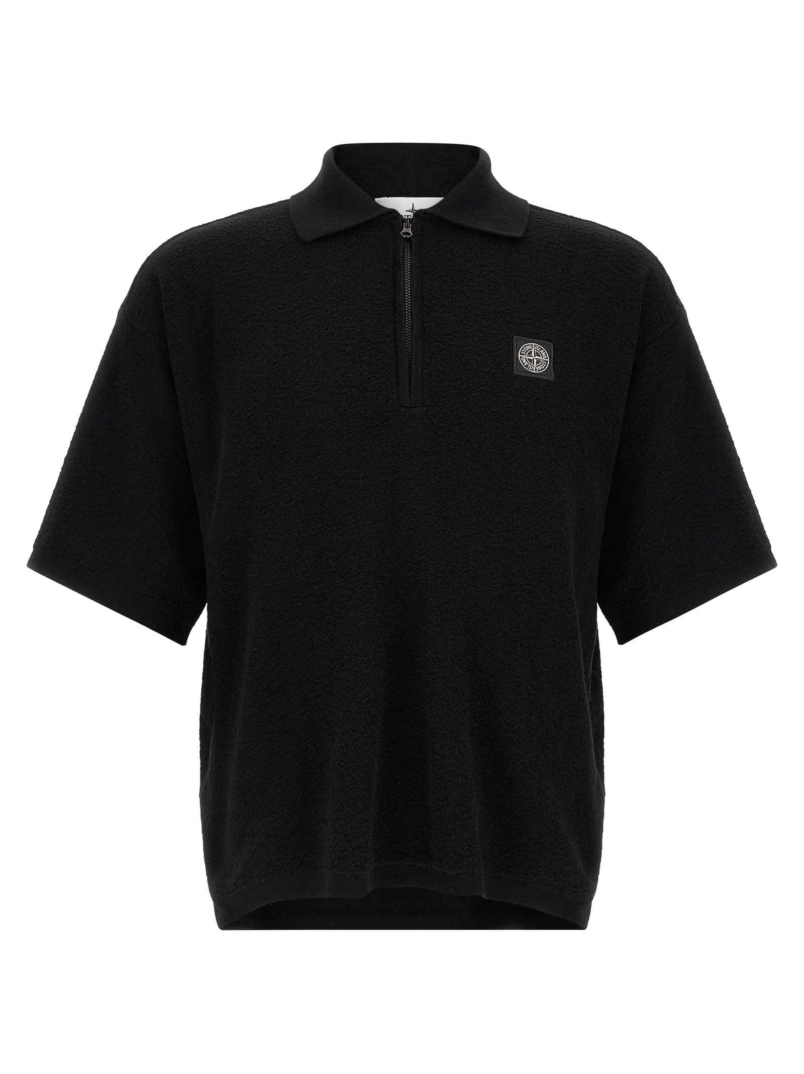 '5100021' polo shirt in light raw cotton 12 fineness, front 'Compass' logo patch, collar and half zip, short sleeves with dropped shoulders, side slits, asymmetrical hem.