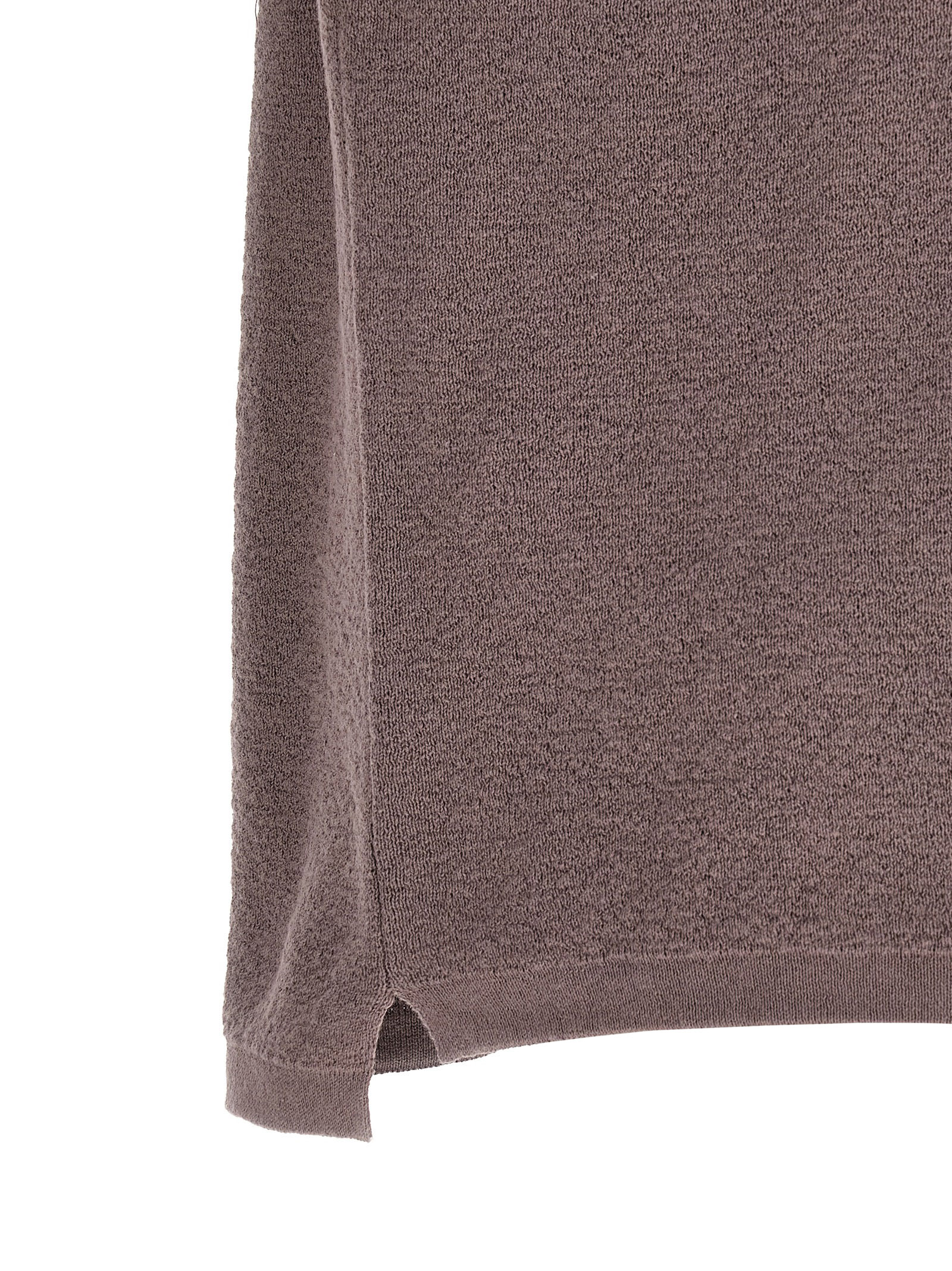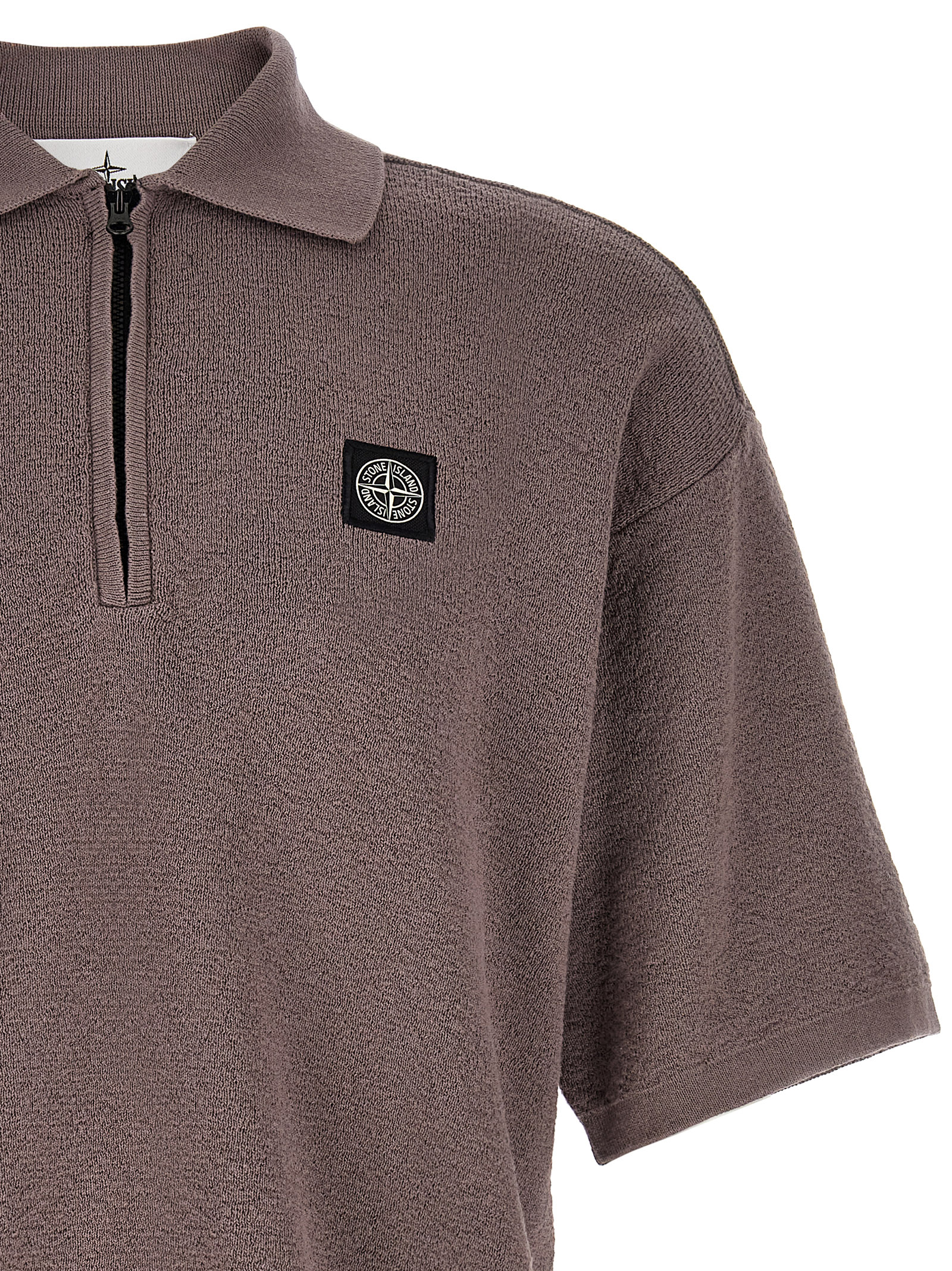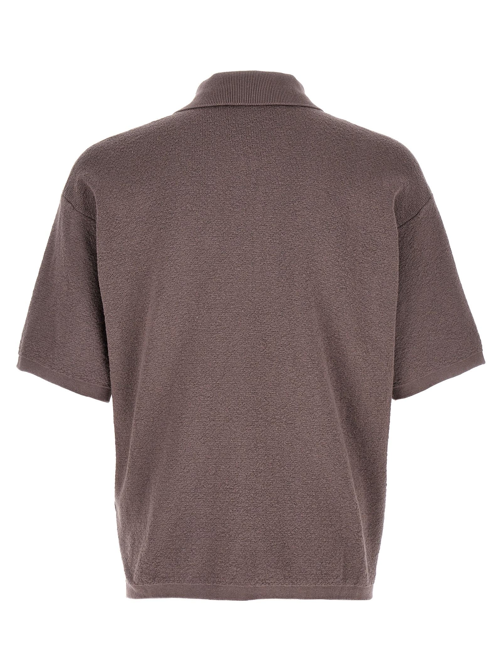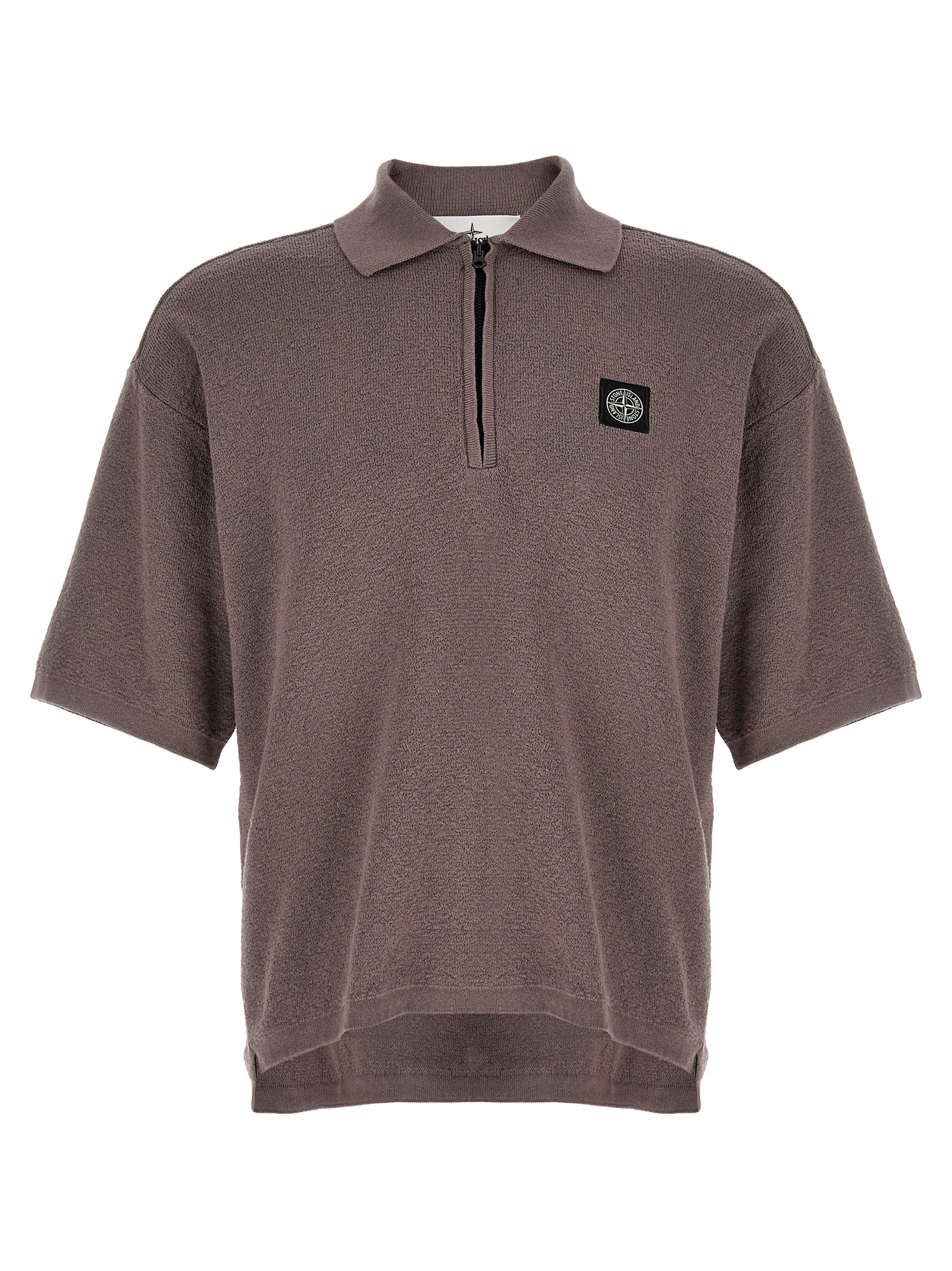 '5100021' polo shirt in light raw cotton 12 fineness, front 'Compass' logo patch, collar and half zip, short sleeves with dropped shoulders, side slits, asymmetrical hem.