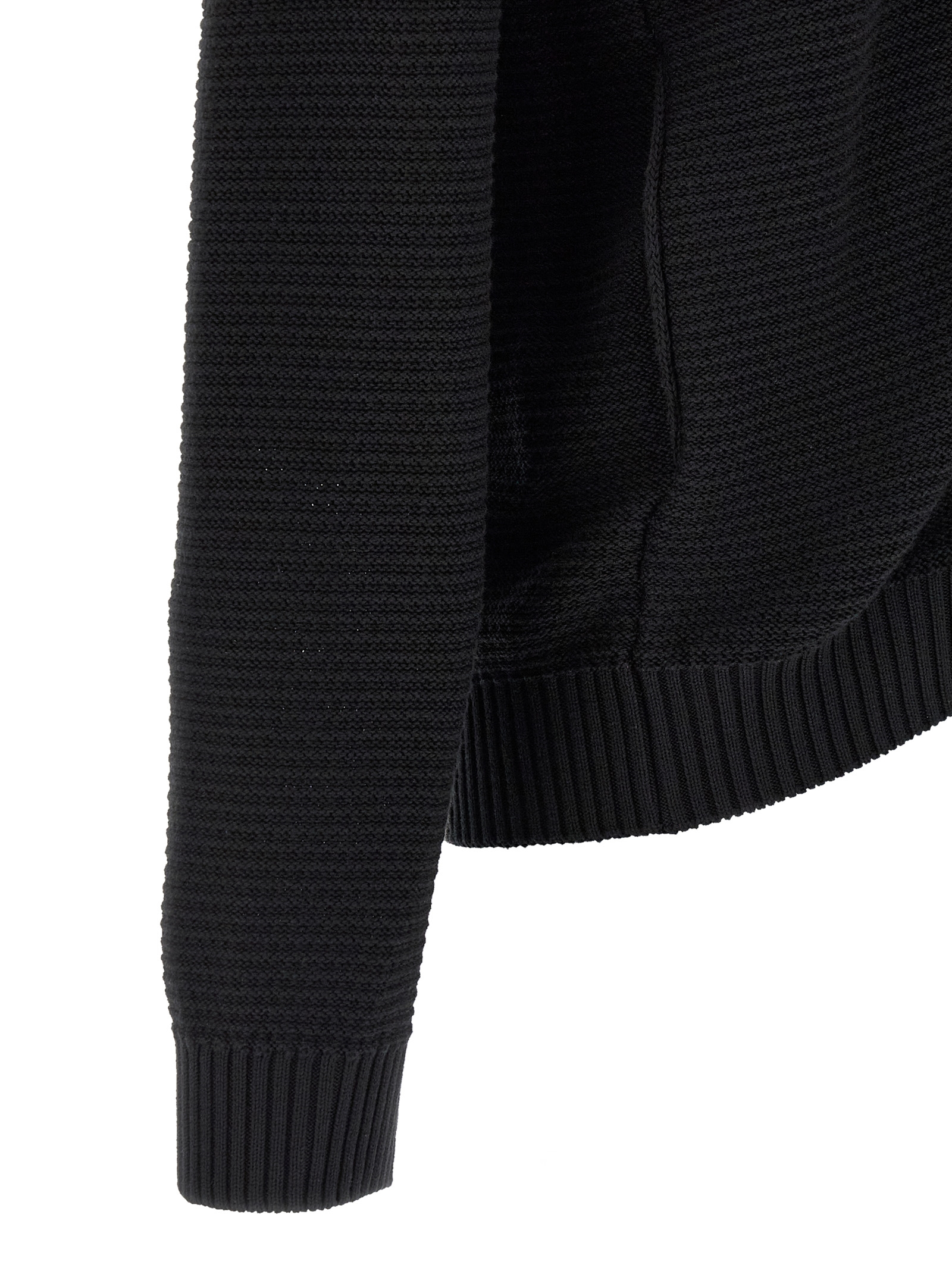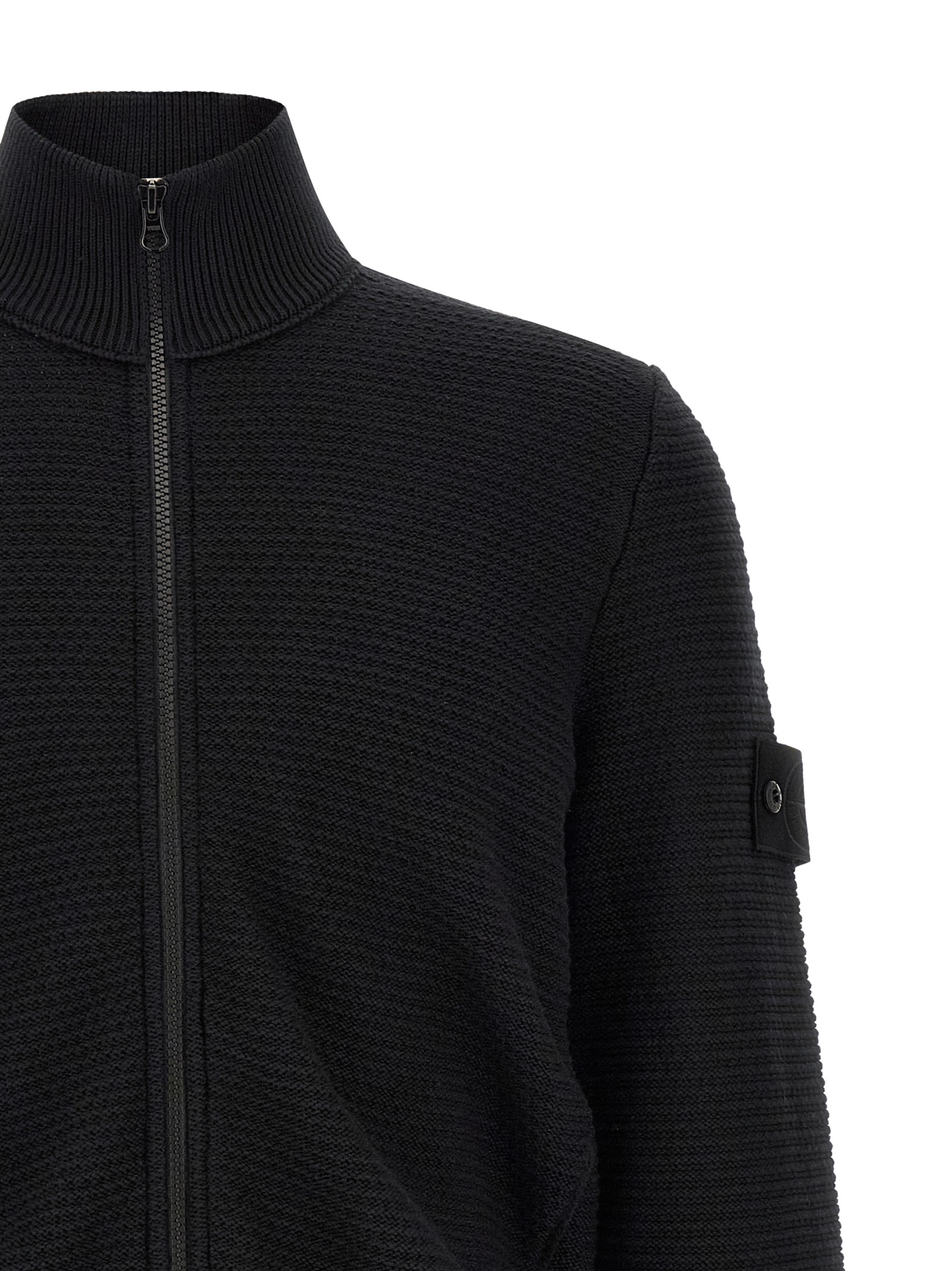Вязаный кардиган из смеси хлопка и кашемира, с высоким воротником, застежкой-молнией спереди, карманами, длинными рукавами с манжетами и аппликацией в виде логотипа в тон.