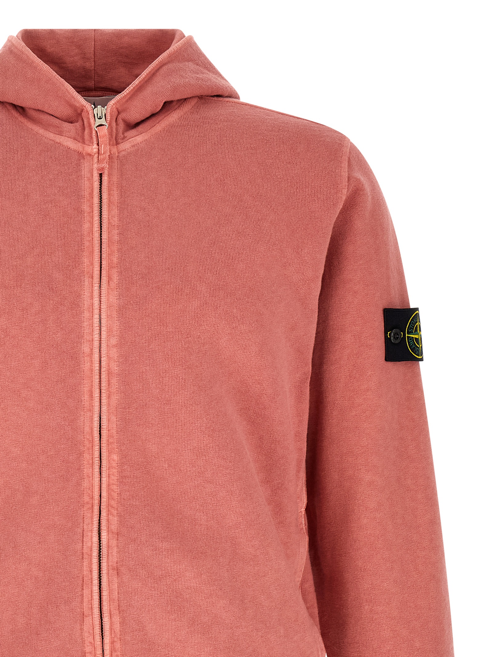 '6100032' hoodie in garment-dyed flamed-effect malfilé cotton with 'OLD' treatment, front zip closure, pockets, long sleeves with cuffs, logo badge, and headband on the hem.