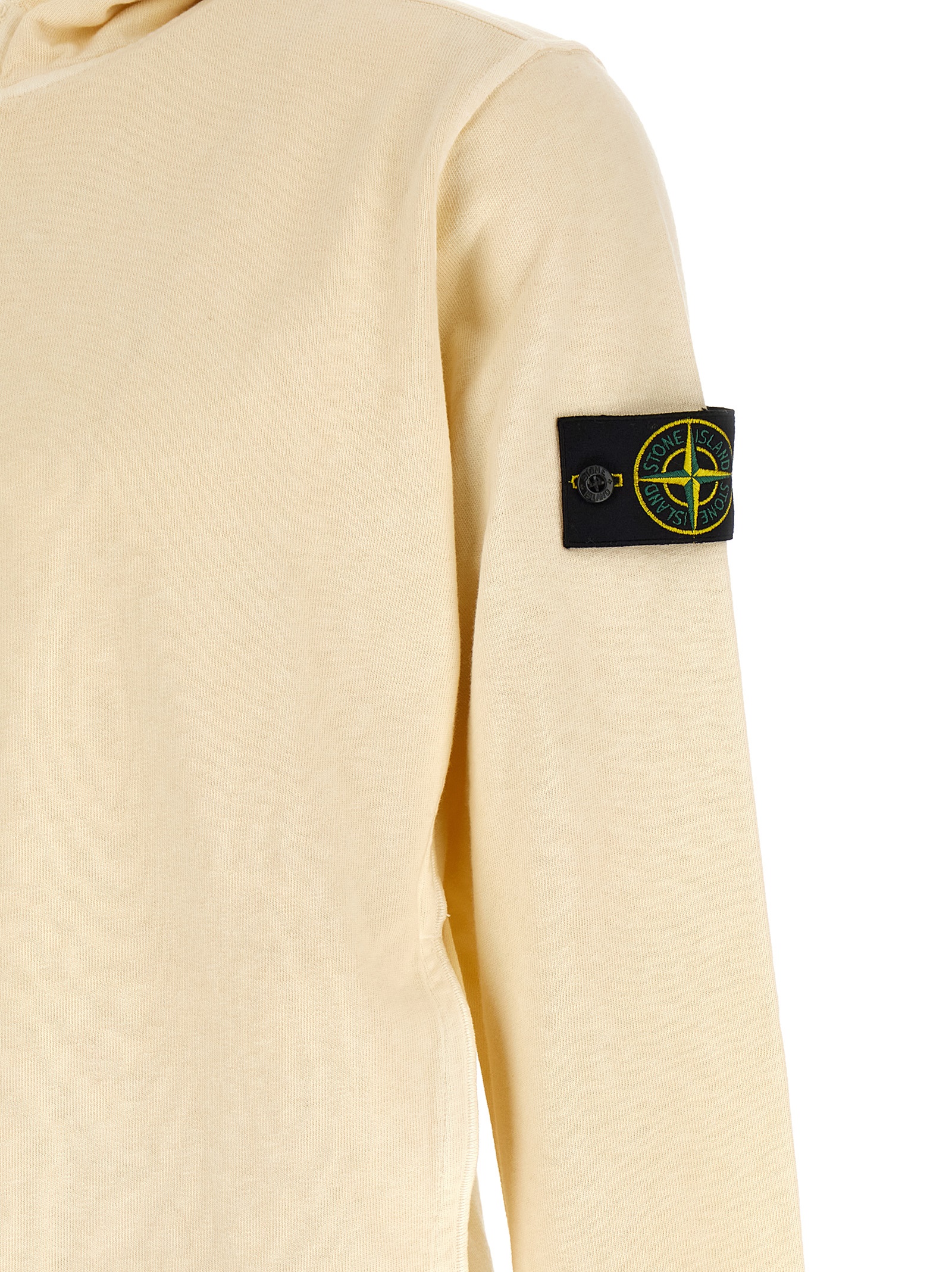 '6100032' hoodie in garment-dyed flamed-effect malfilé cotton with 'OLD' treatment, front zip closure, pockets, long sleeves with cuffs, logo badge, and headband on the hem.