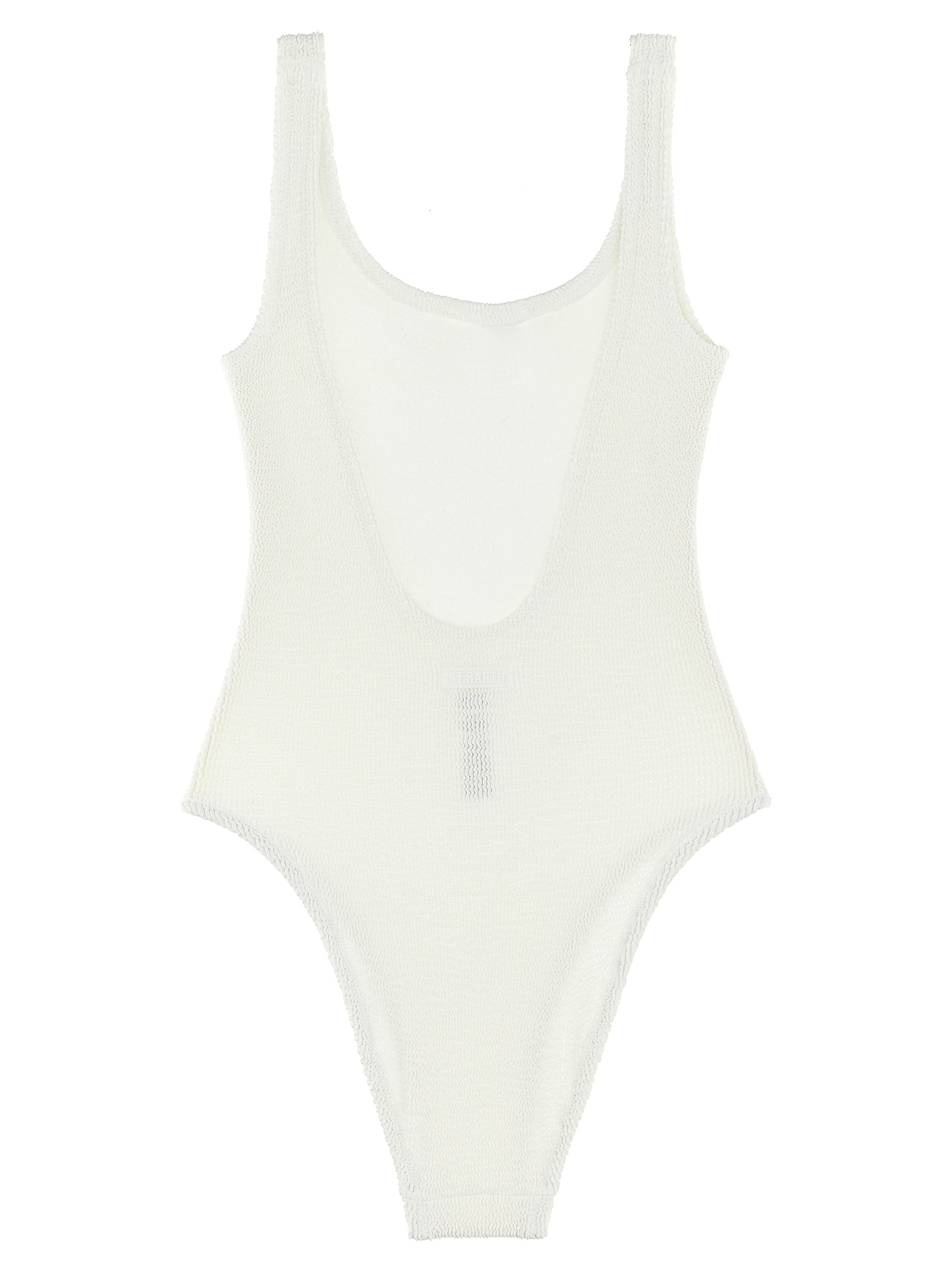 'Lora' crinkle fabric one-piece swimsuit with round neckline at the front, wide round neckline and back logo patch, and high-cut bottoms.
