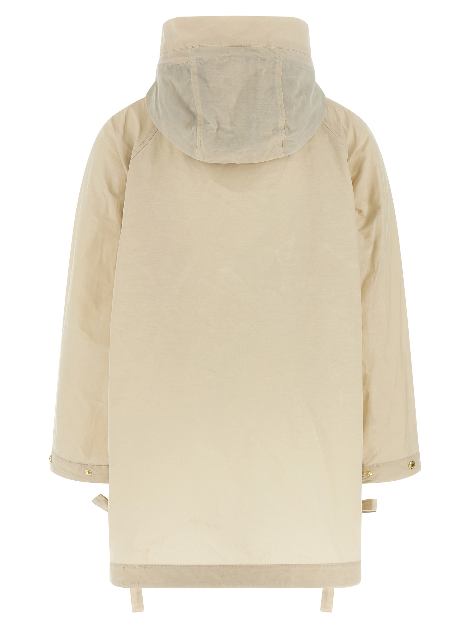 'Middlemarch' rainproof jacket in cotton blend that is dry to the touch with tartan details inside the hood and turn-ups, parka model, elongated and flared silhouette, adjustable hood, high neck, logo embroidery and front zip closure, pockets, adjustable raglan long sleeves with snap button on the cuffs and fold-up, side slits with fabric laces, and asymmetrical hem.