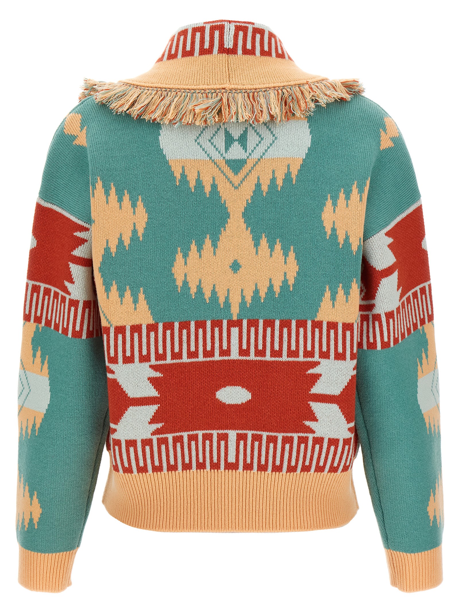 Cashmere and virgin wool cardi-bomber jacket with double jacquard 'Alanui' pattern, bomber cardigan, shawl collar with fringes, front button closure, long sleeves with cuffs and dropped shoulder.Характеристики товара