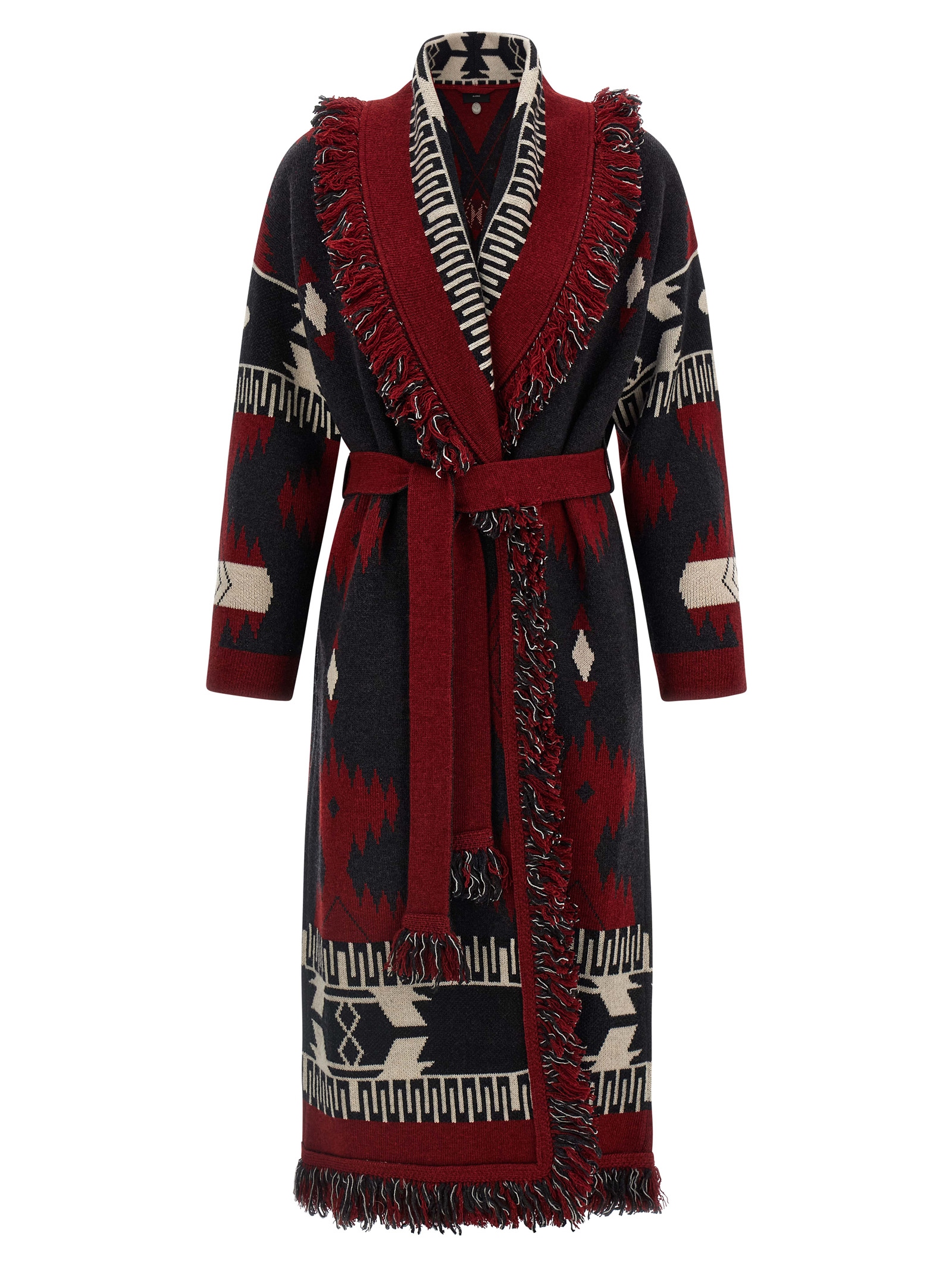 Длинное пальто Icon из мериносовой шерсти двойного жаккарда «Alanui», фасон «халат», с V-образным вырезом и бахромой по краям, длинными рукавами, карманами и съемным поясом.