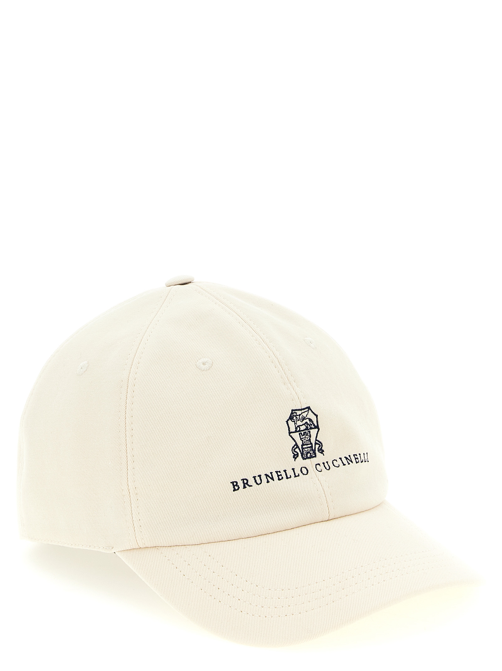 Garment-dyed twisted cotton gabardine hat, 'Baseball' model, embroidered Solomeo heraldic coat of arms logo on the front, adjustable leather strap at the back.