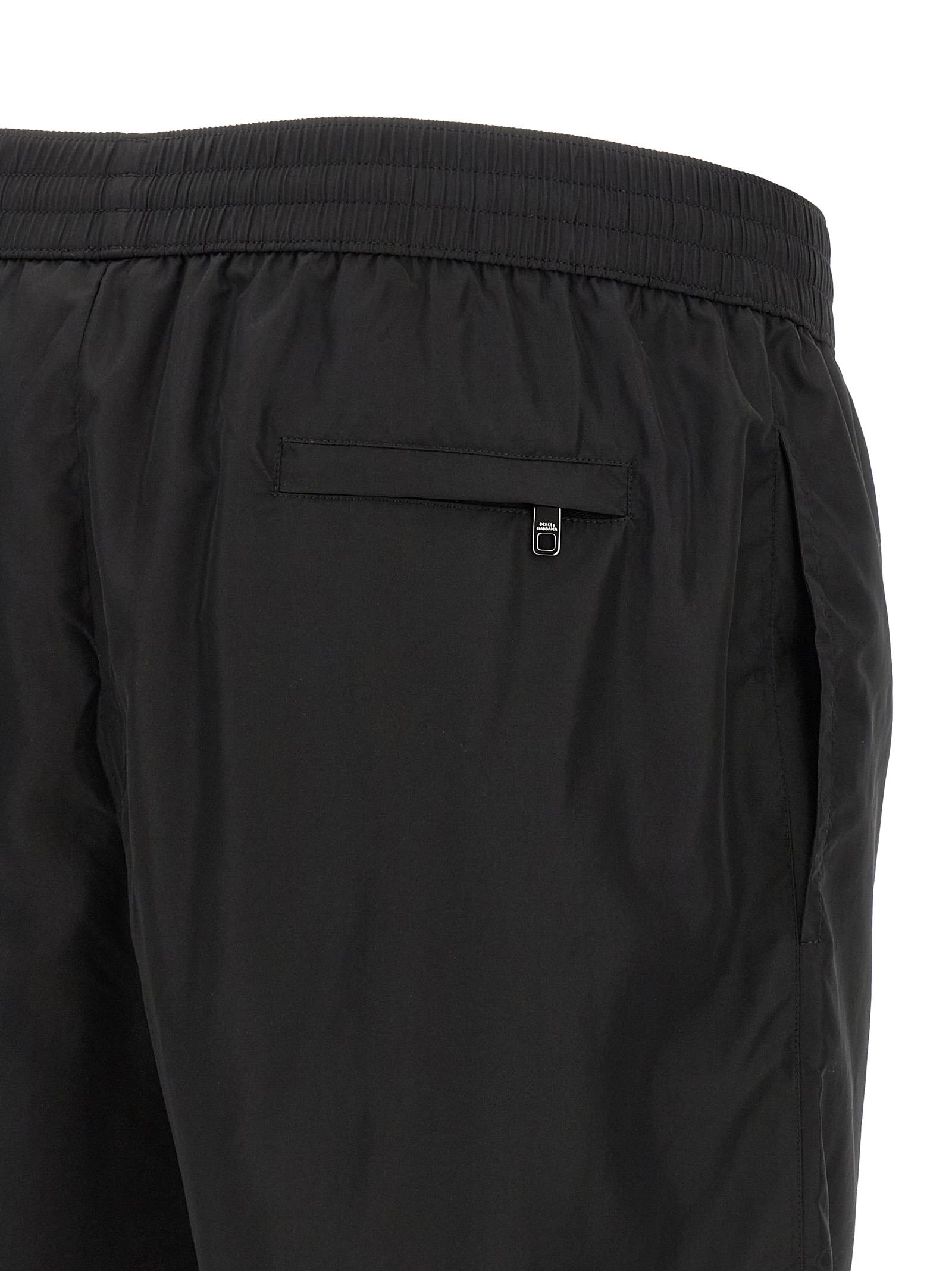 Light nylon swimsuit, medium model, metal plate with front engraved logo, adjustable drawstring elastic at the waist, trompe l'oeil flap, pockets, inner briefs.