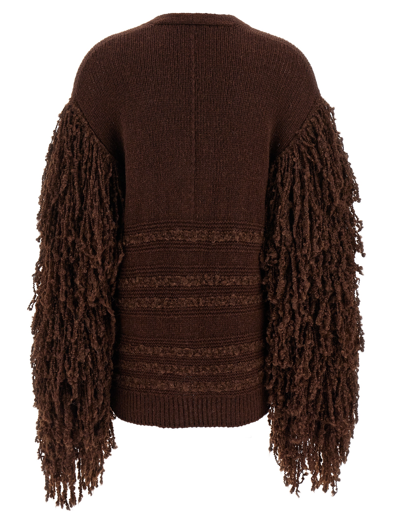 Camel wool cardigan with bouclé inserts and fringes, V-neck, front button closure, long sleeves with cuffs and dropped shoulders.