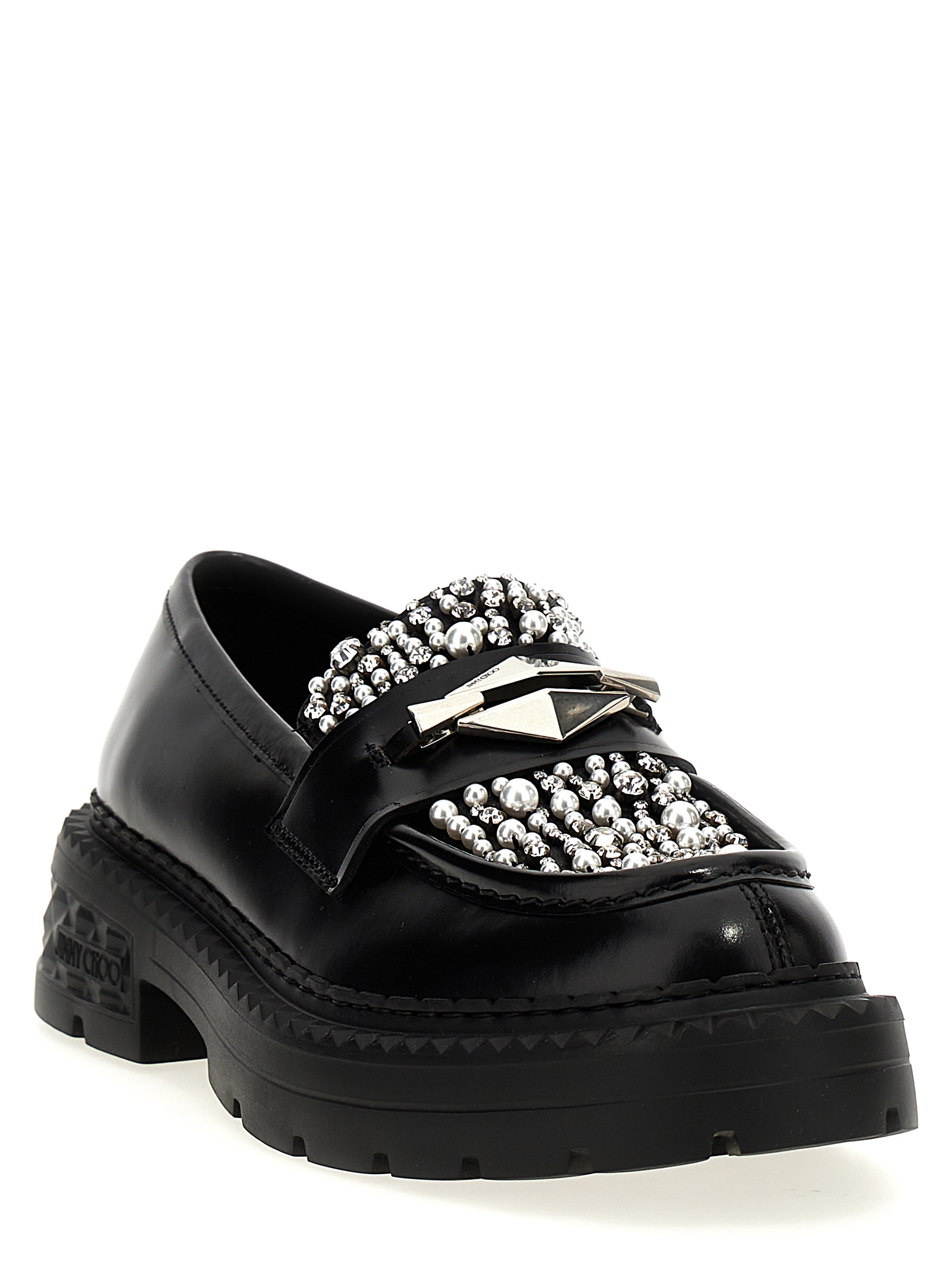 'Marlow Diamond' leather loafers with metal rhinestone detail and front pearls, rubber sole.
