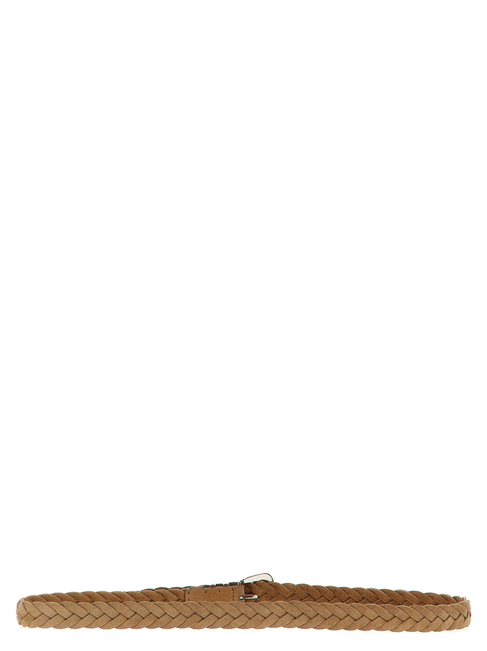Braided reverse calfskin belt with antique-effect metal buckle, tip, and loops.