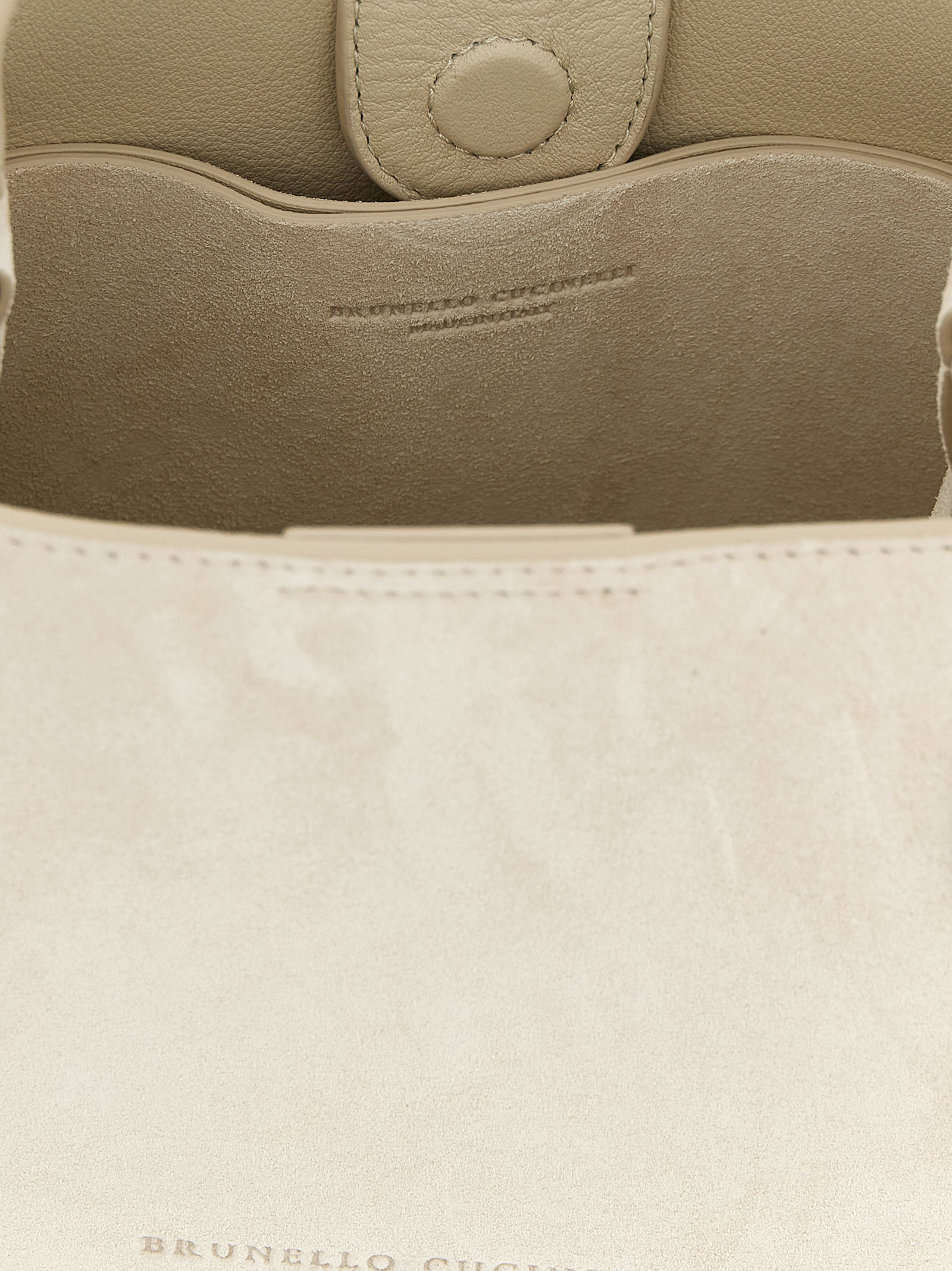 Suede handbag with trapezoidal gusset shape, fixed handle and magnet closure, adjustable and removable leather shoulder strap, side 'Monile' details, removable inner pocket with snap buttons.