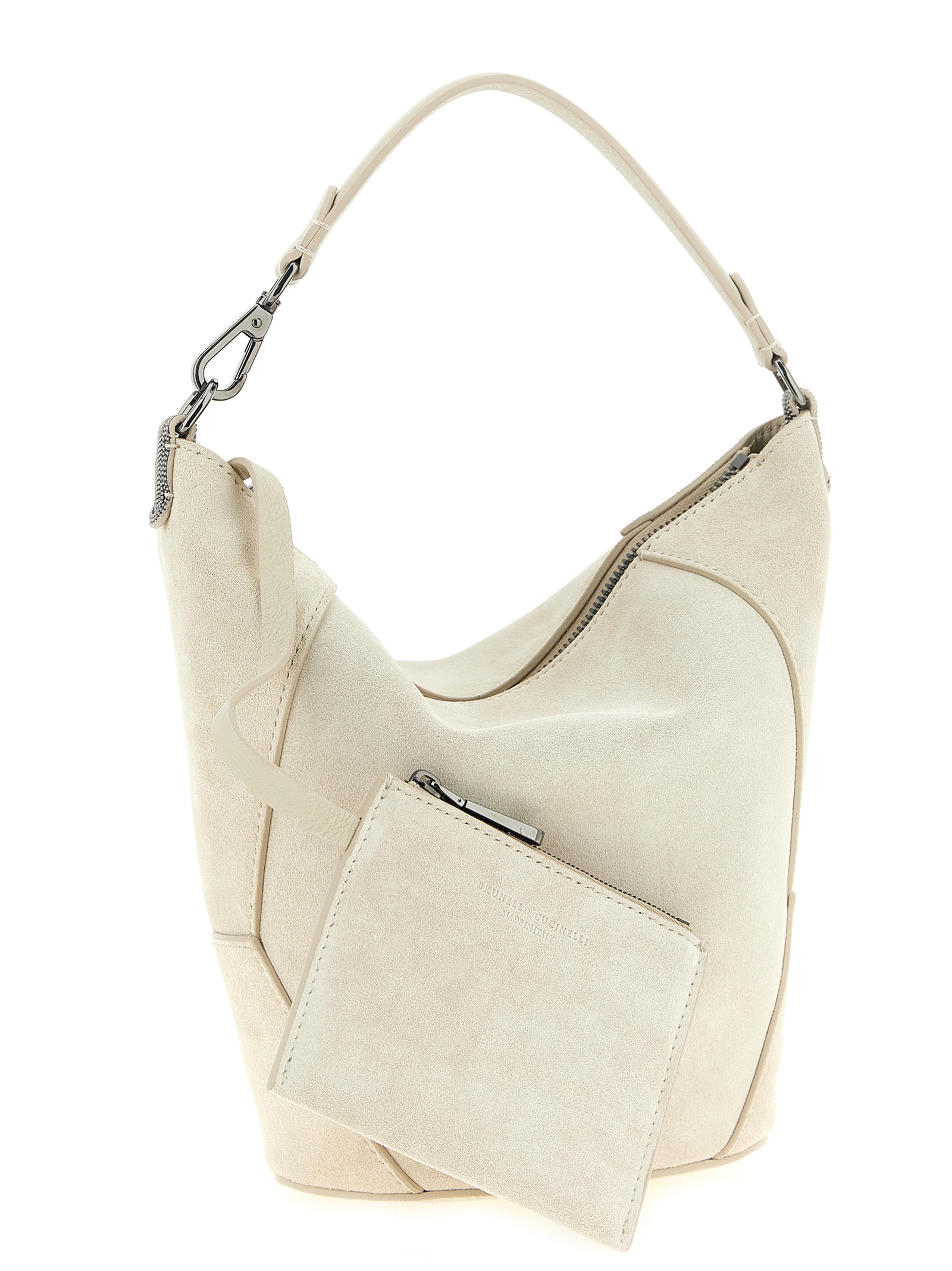 Suede handbag with geometric stitching gon, front embossed logo, foldable eyelet handle with snap hook, zip closure, inner coin wallet with zip and leather lacing, side 'Monile' details, adjustable and removable shoulder strap.