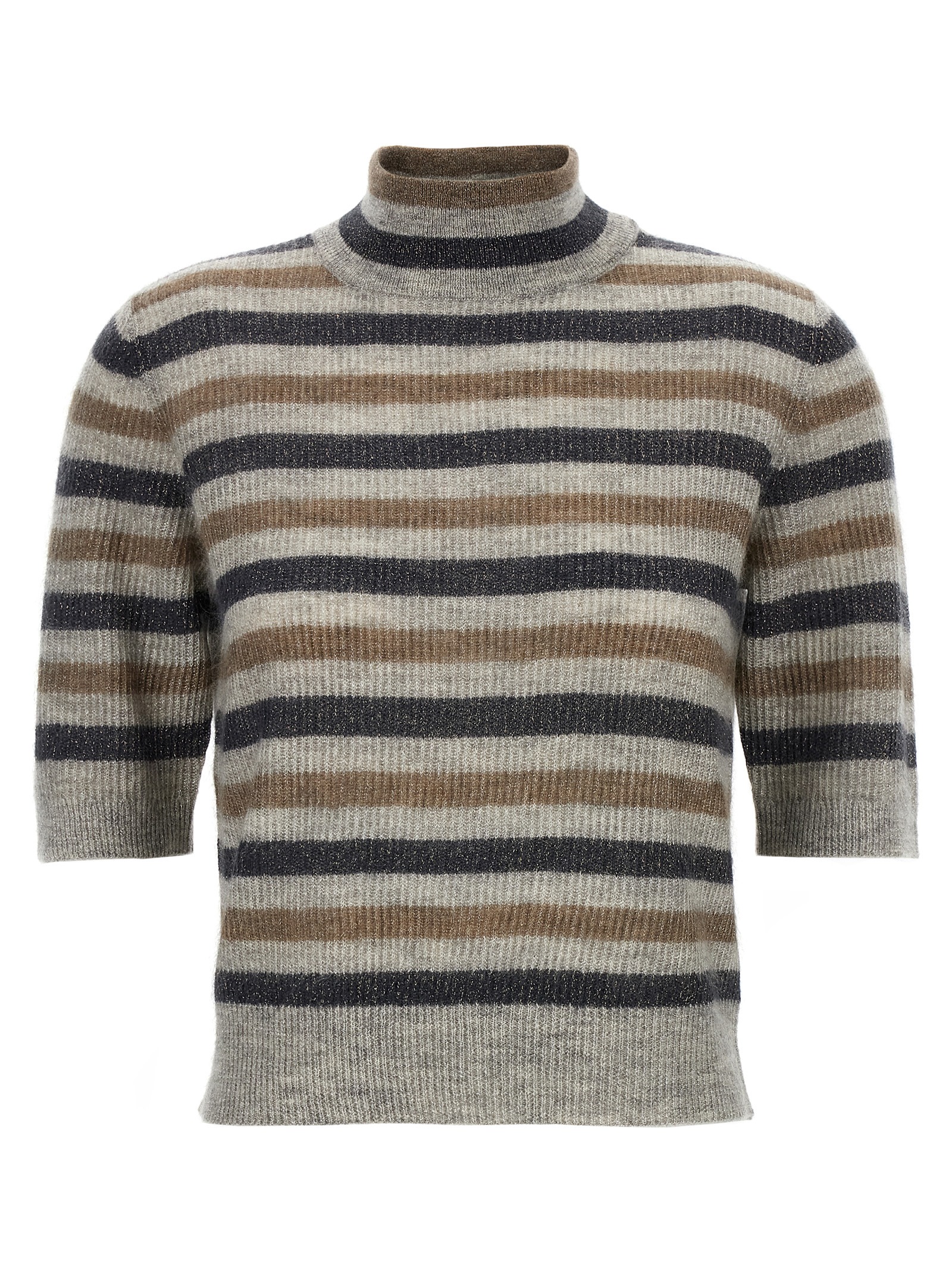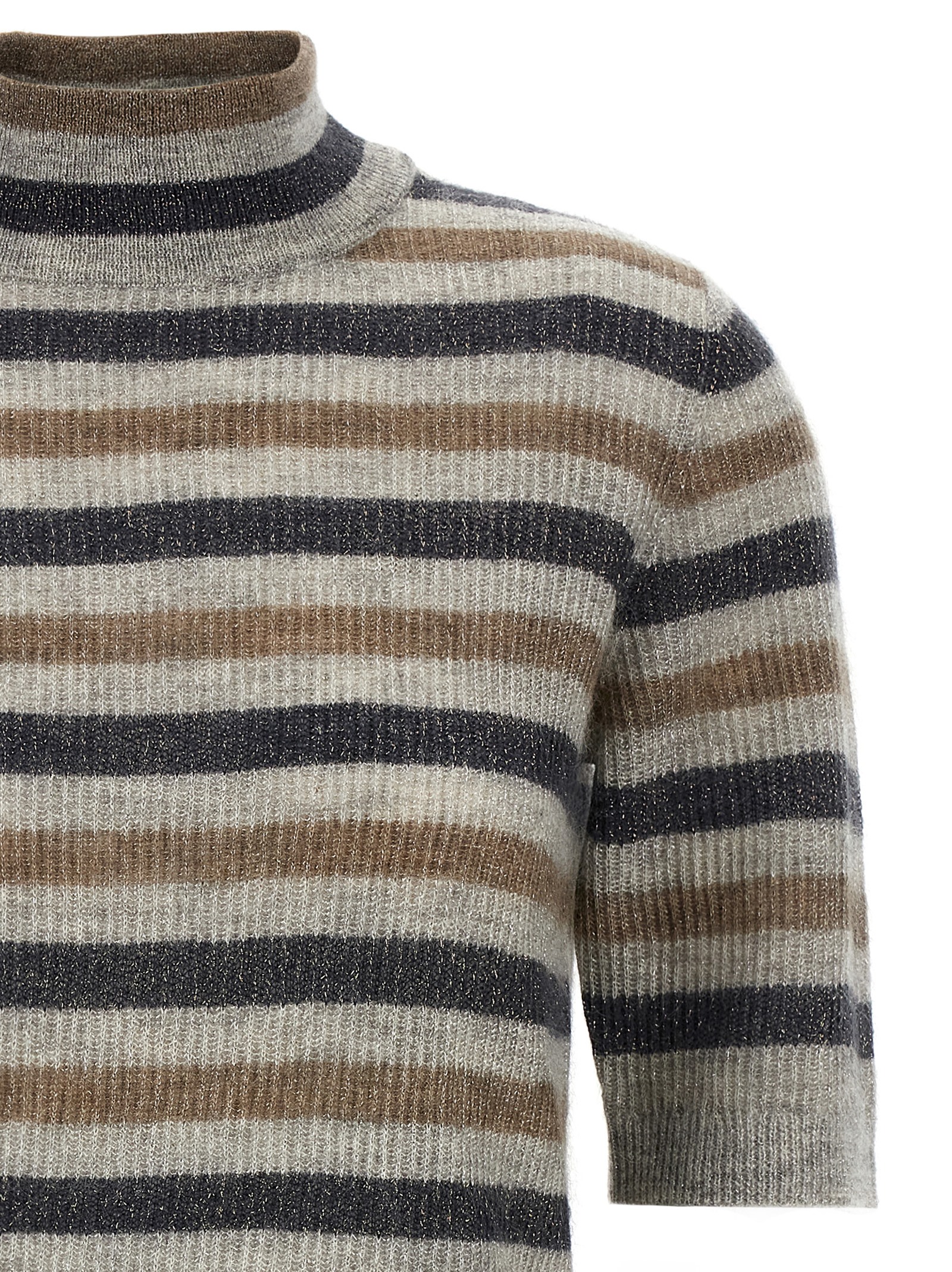 Полосатый свитер из шерстяной смеси с люрексовыми нитями, укороченный, с высоким воротником и короткими рукавами.