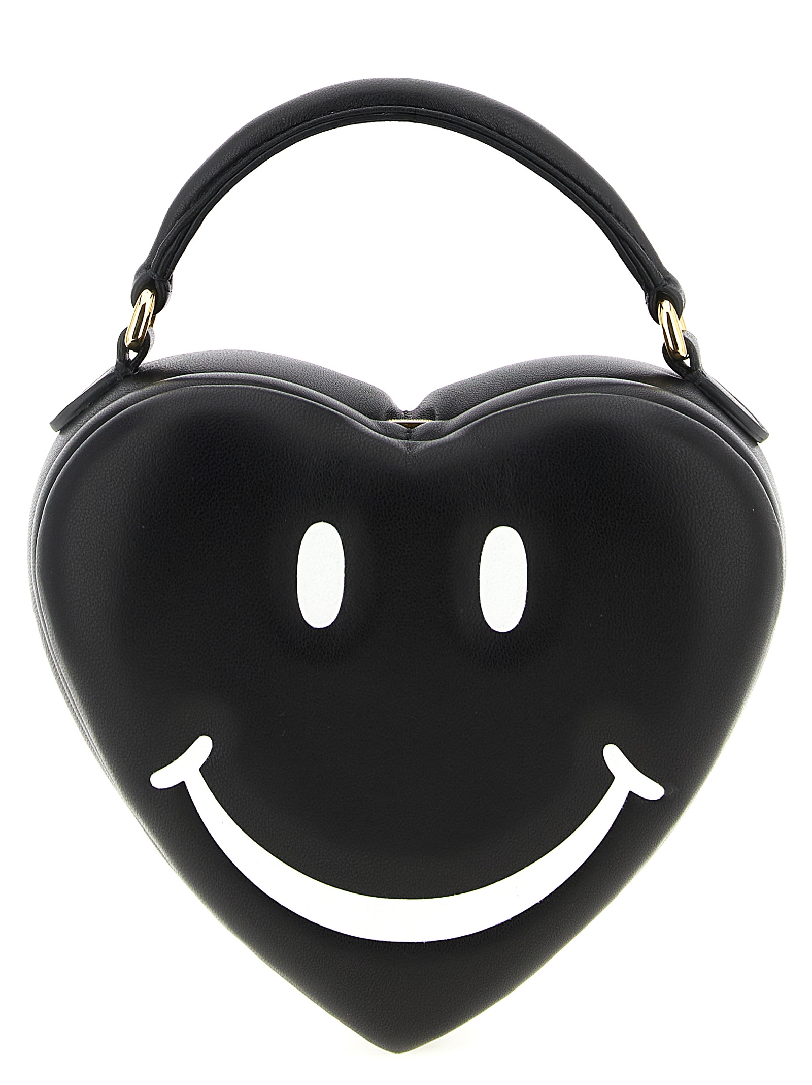 'Moschino Love Me' nappa leather handbag padded with double-layer foam, heart shape with contrast embossed smile, back embossed logo, fixed handle, snap top opening, adjustable and removable shoulder strap. The leathers used are all of the highest quality, naturally tanned and finished by hand. Any grains or small imperfections are its value.