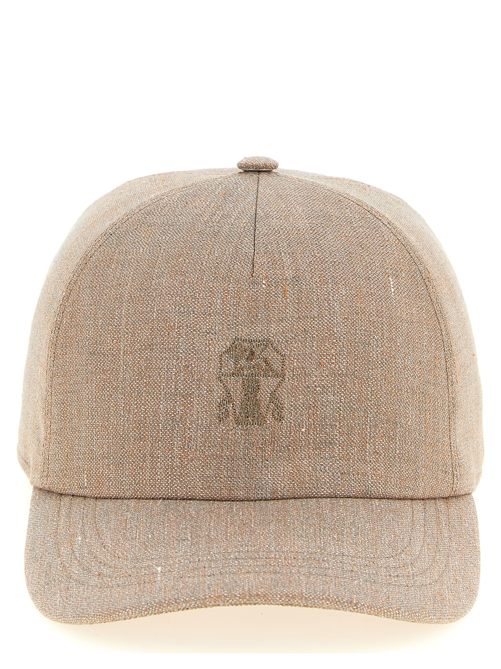 Sparkling linen twill hat with lamé thread, 'Baseball' model, embroidered Solomeo heraldic coat of arms logo on the front, adjustable leather strap on the back.
