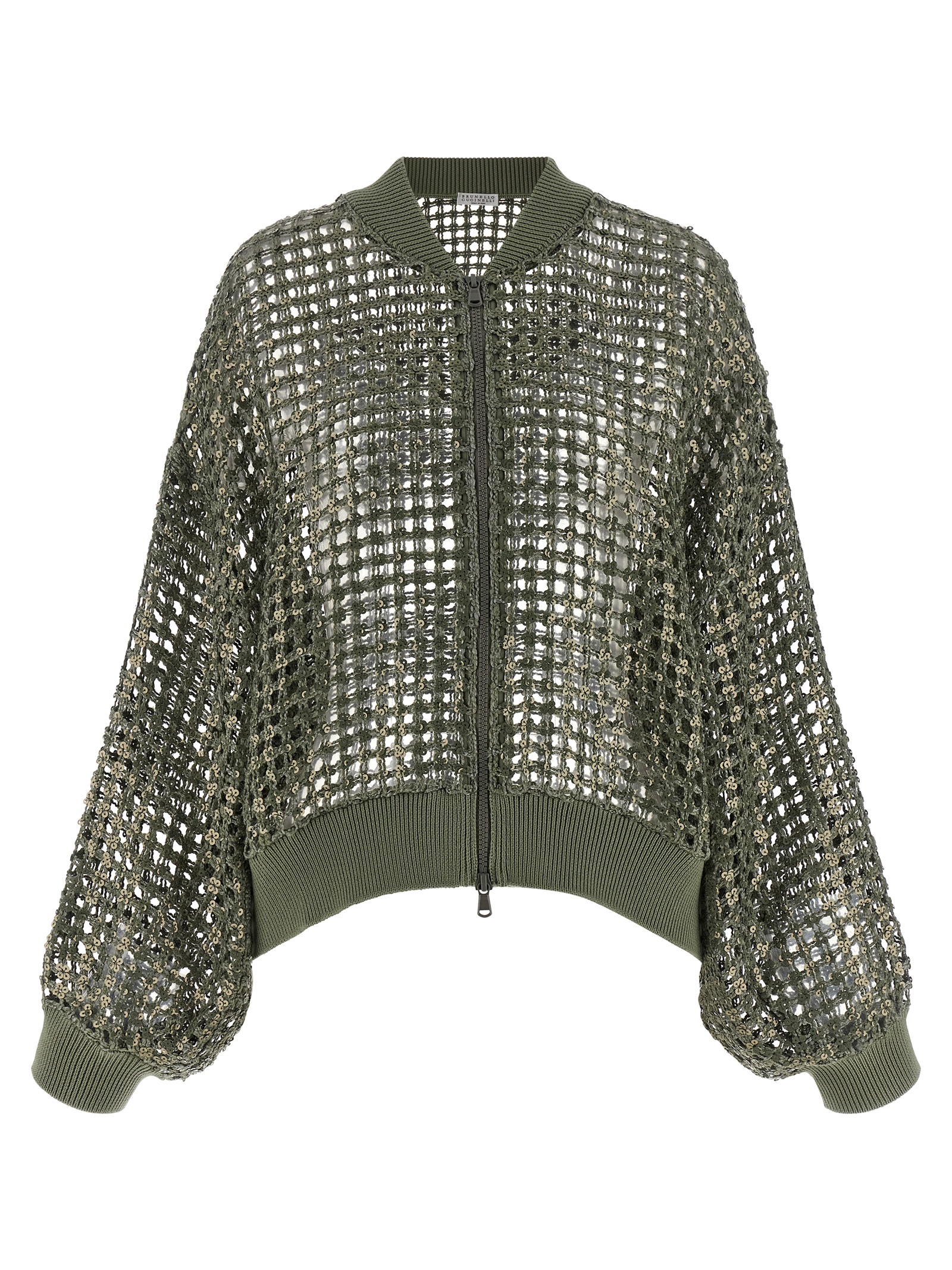 Dazzling Net Embroidery' mesh knit silk and linen cardigan with all-over tone-on-tone sequin appliqué, tone-on-tone ribbed knit details, high neck, front zip closure, long sleeves with cuffs and dropped shoulders, and band on the hem.