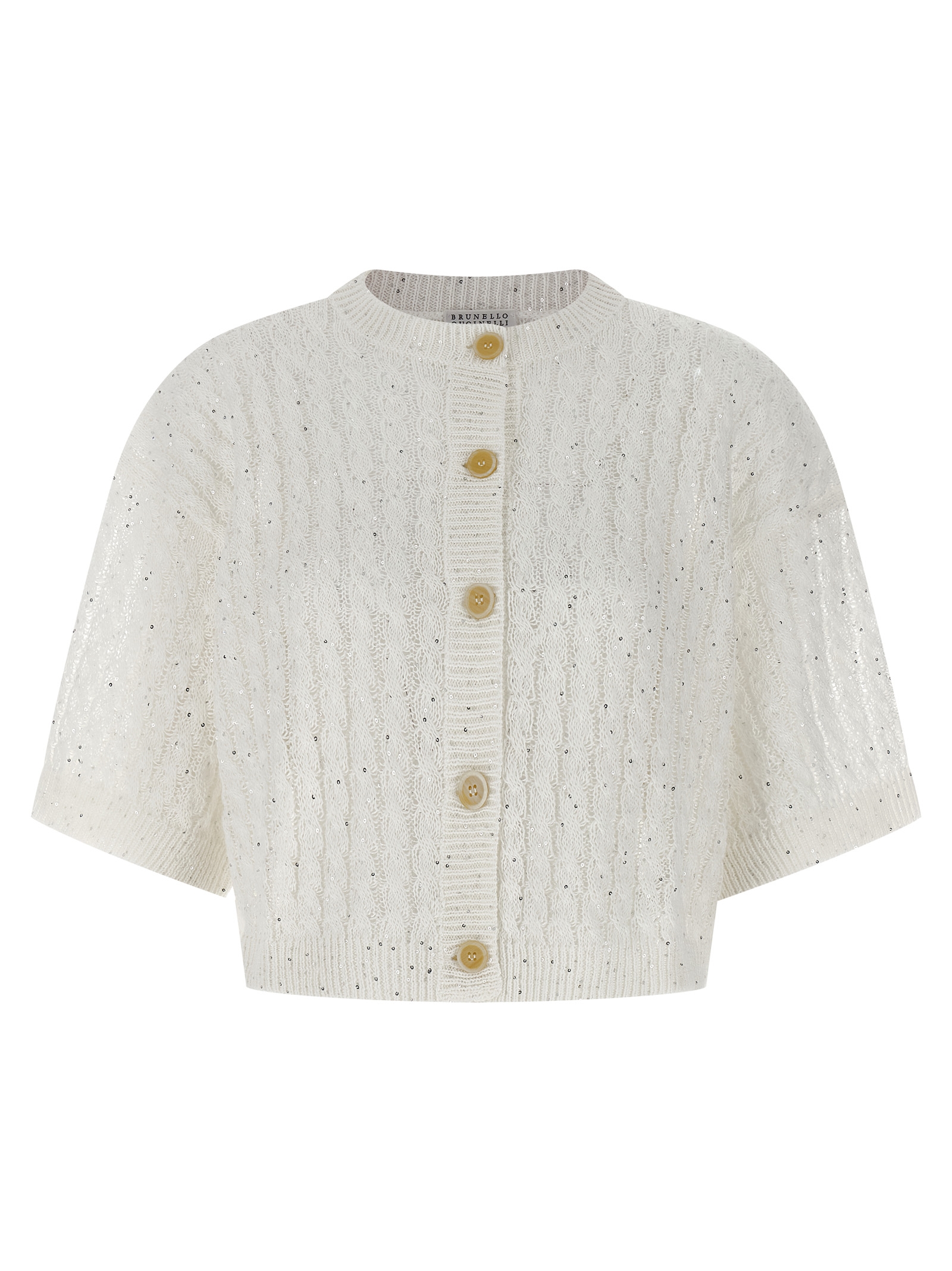 'Dazzling Cable' openwork ribbed linen cardigan with braided pattern and all-over sequin application, crop model, crew neck, short sleeves with cuffs and dropped shoulder.