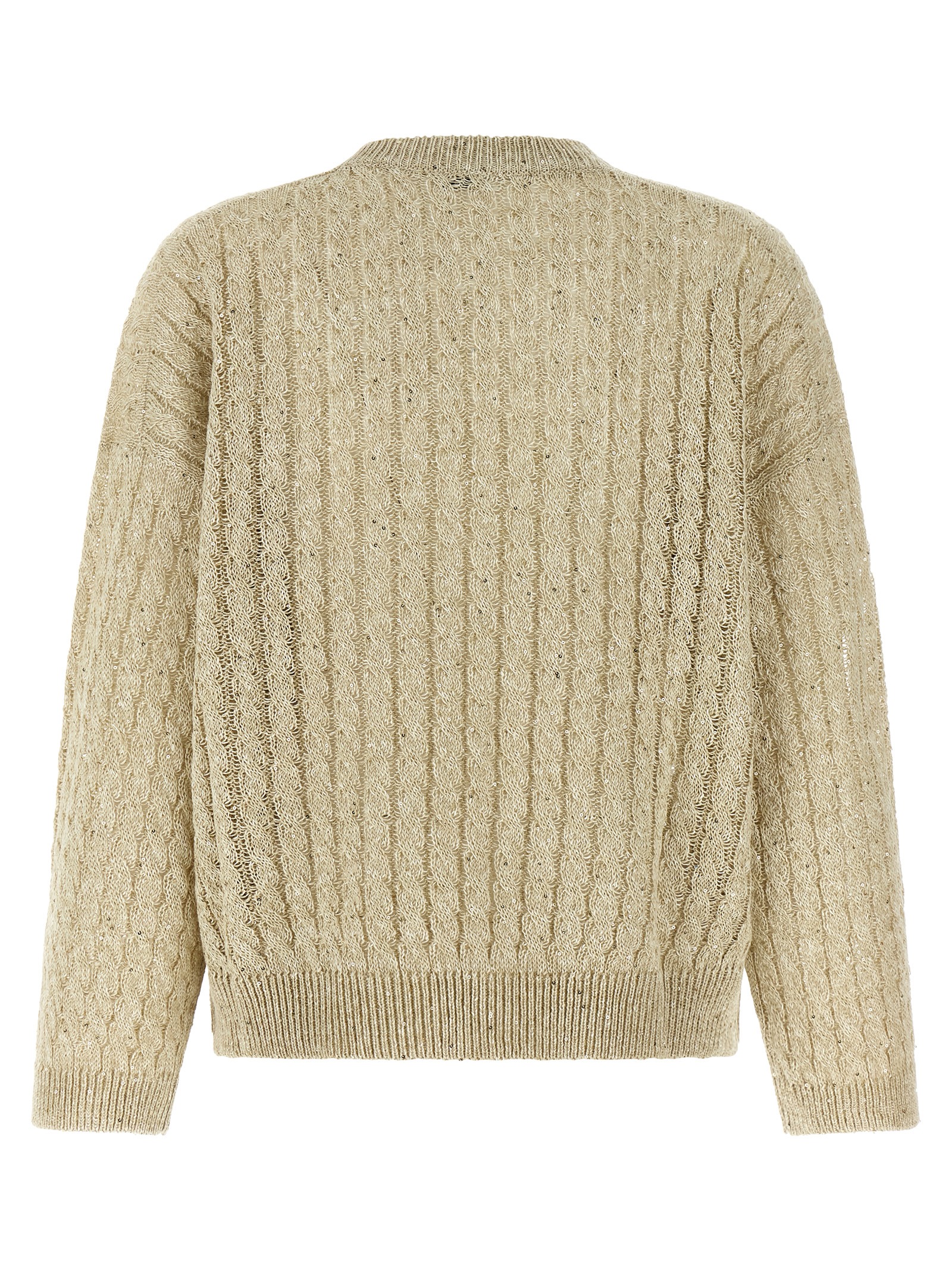Dazzling Cable' openwork ribbed linen sweater with braided knit and all-over sequin appliqué, crew neck, long cuffed sleeves and dropped shoulder.
