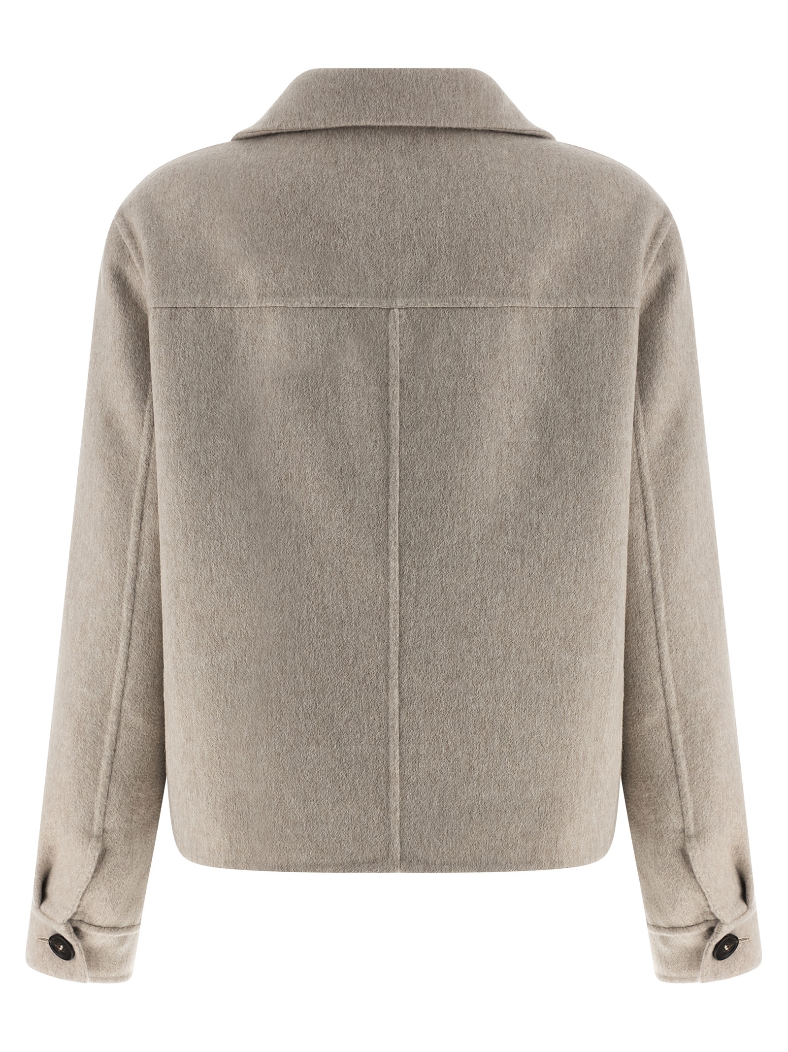 Cashmere short coat, unlined, double-breasted with front button closure, shirt collar, pockets, long sleeves with cuffs.