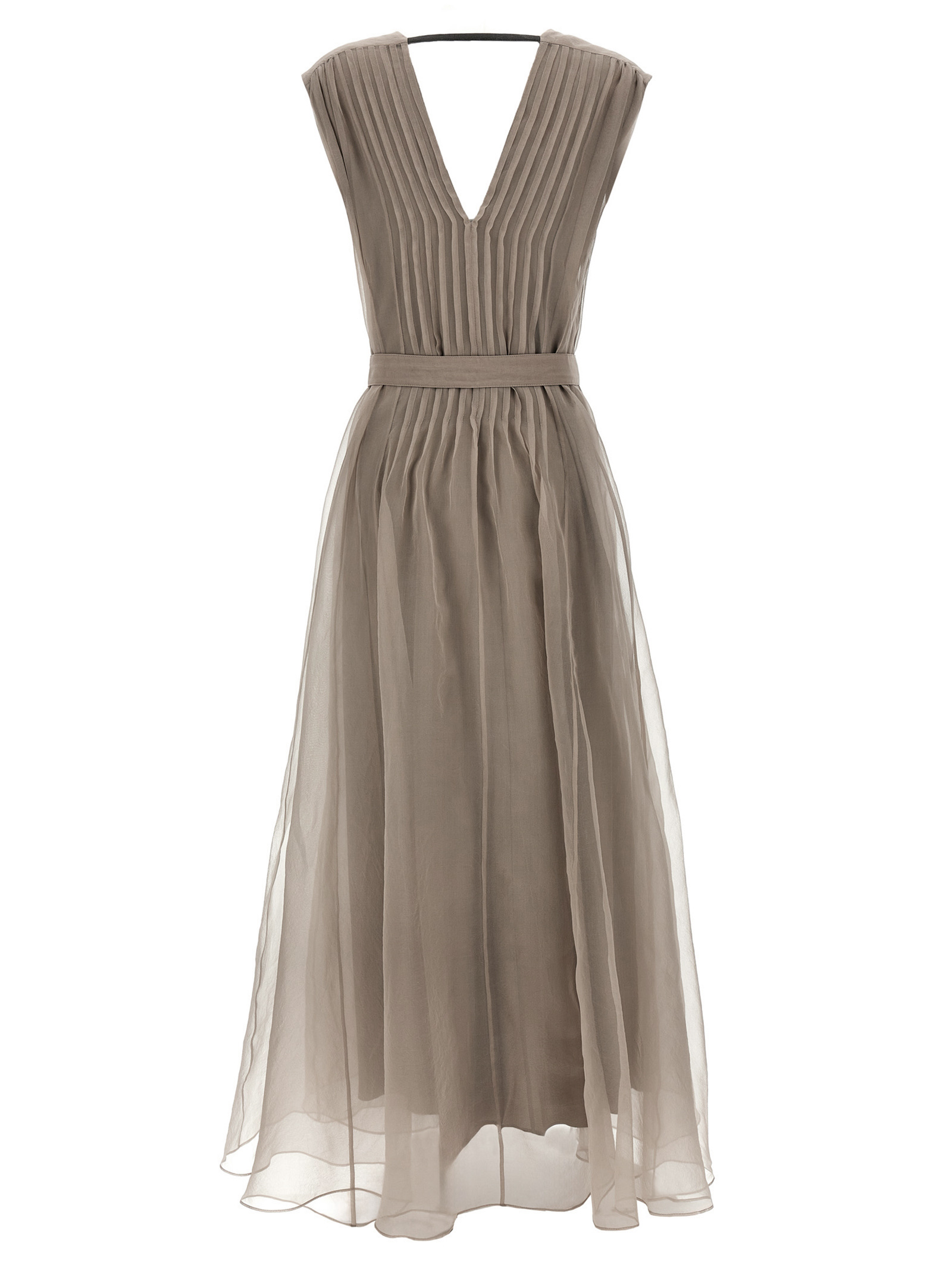 Long silk dress with pleats on the front and back, V-neck on the front and back with Monile detail on the back, sleeveless, integrated petticoat, removable matching belt.Характеристики товара