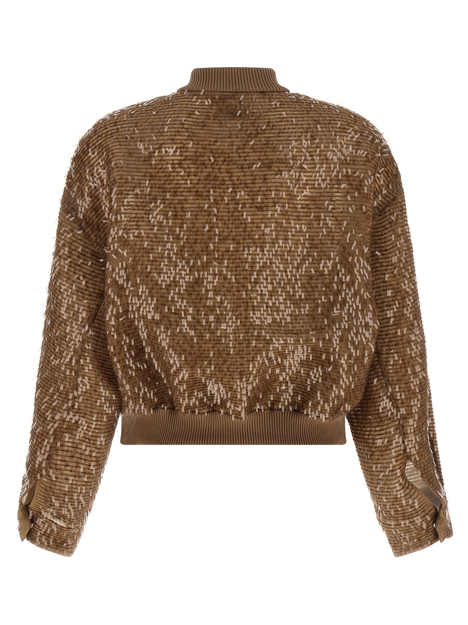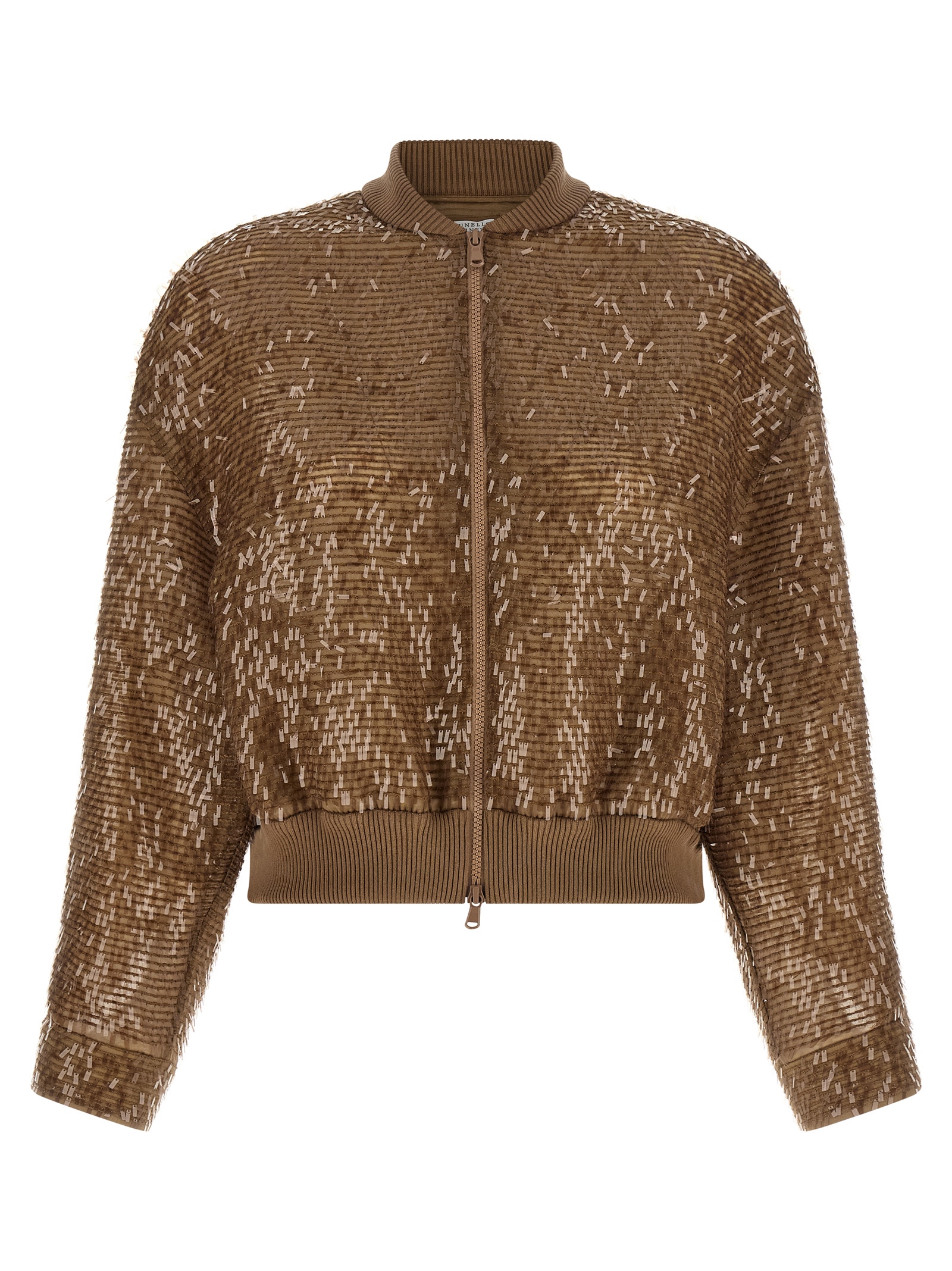 Silk cardigan with all-over sequin embroidery, bomber style with ribbed knit collar and hem, front zip closure, long sleeves with adjustable cuffs with automatic.