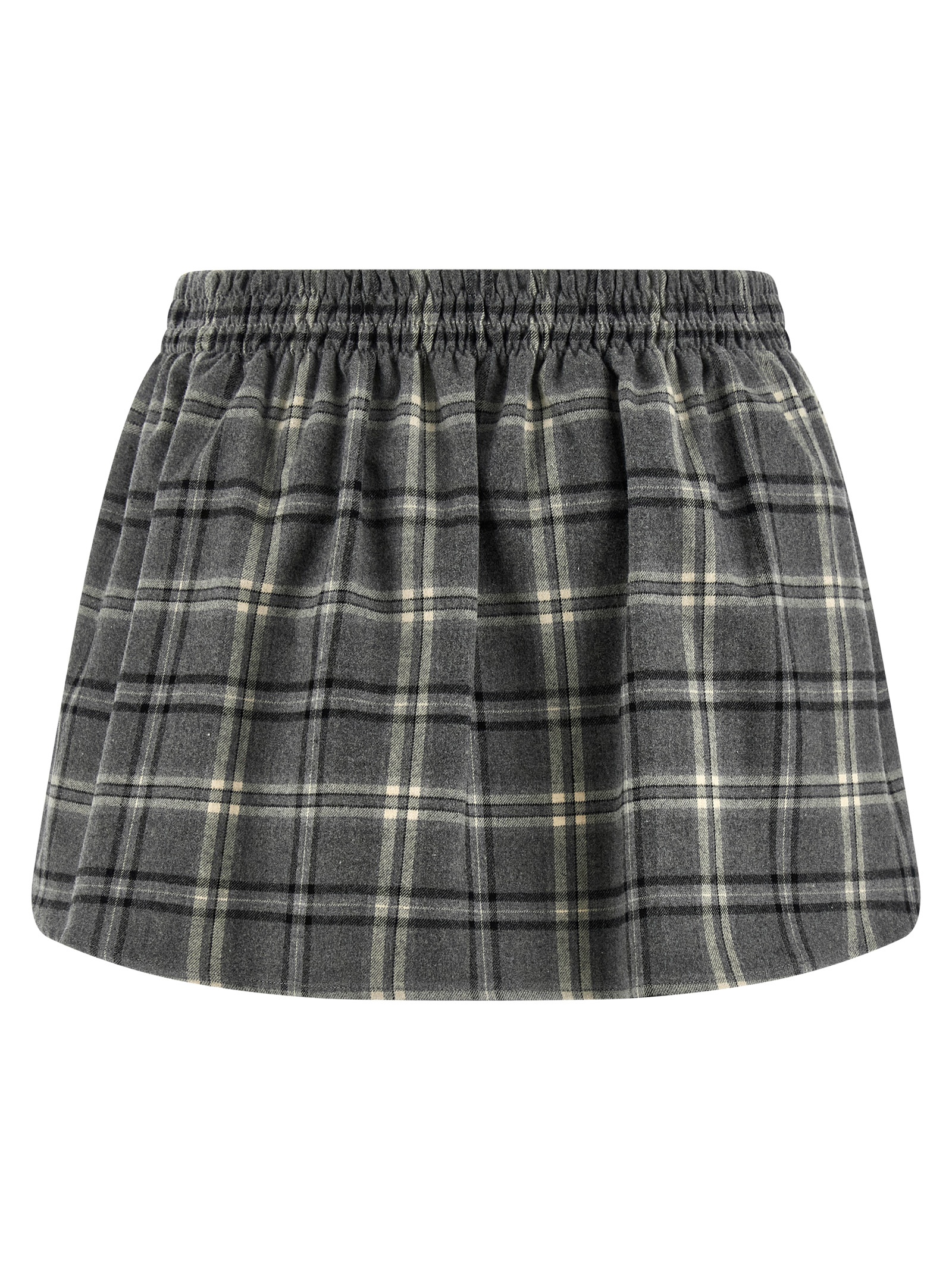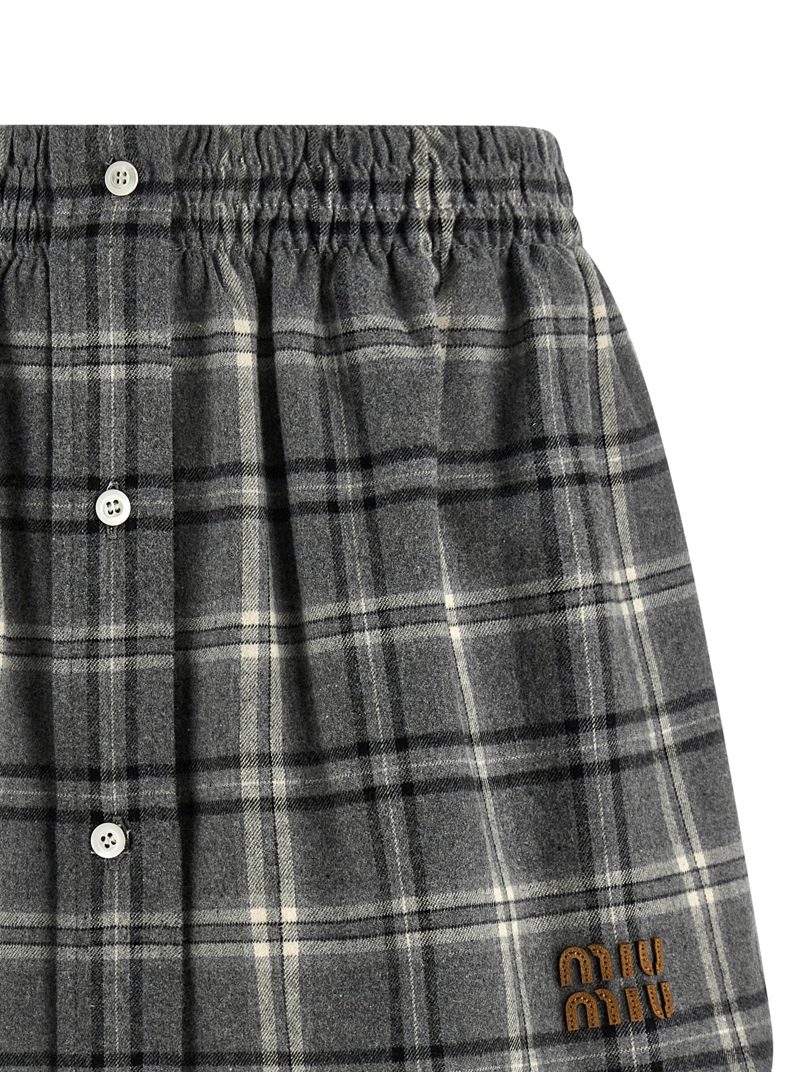 Check print cotton flannel mini skirt, lettering logo embroidery and front button closure, elastic waistband, pockets, unlined.