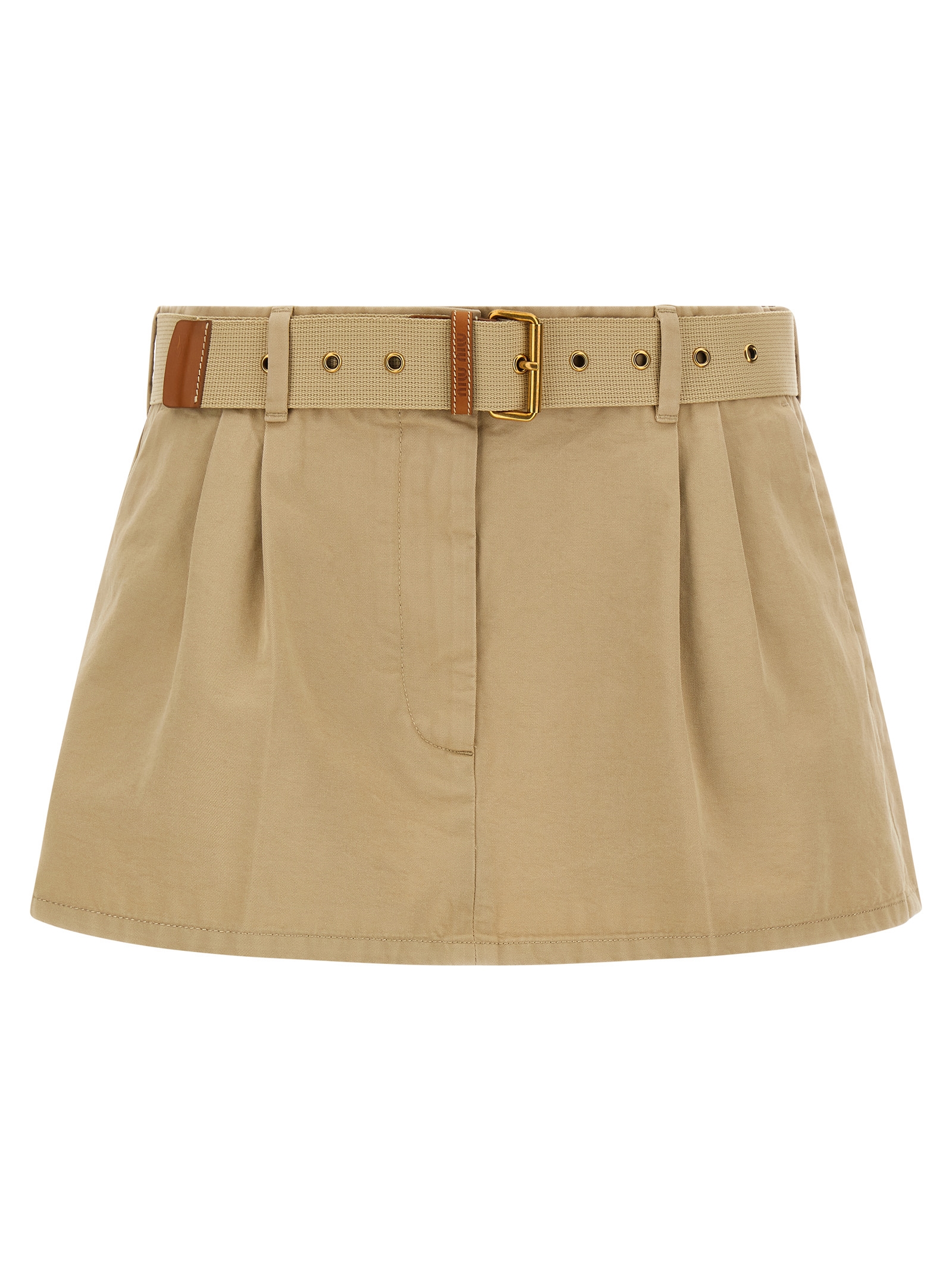 Old cotton gabardine mini skirt, tone-on-tone logo patch on the back, pin tucks, front zip and button closure, pockets, tape belt with removable metal buckle.