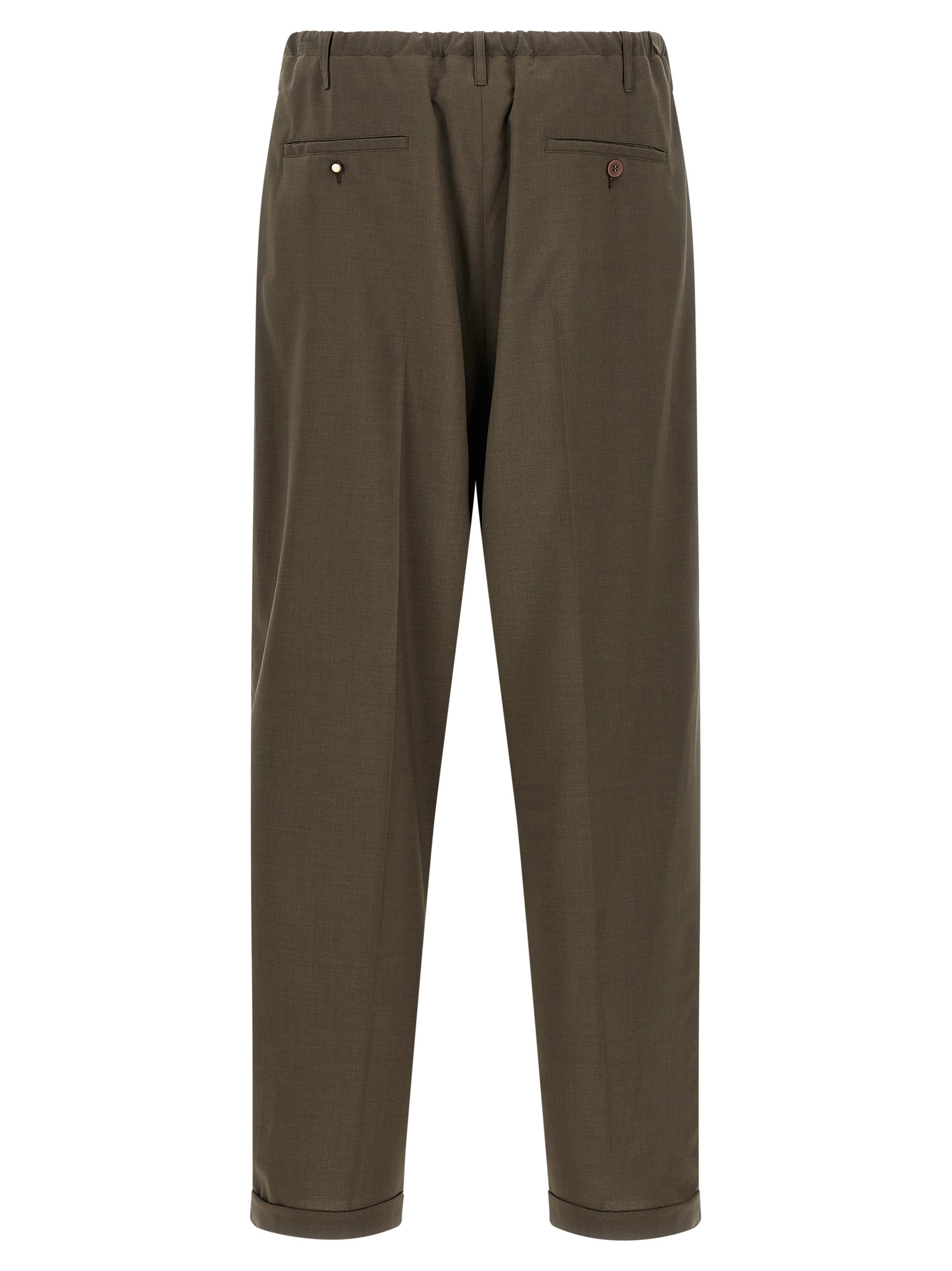 Classic 'People's pant' trousers with front stretched pleat and turn-up hem, pockets, zip closure, elastic waistband with adjustable drawstring.