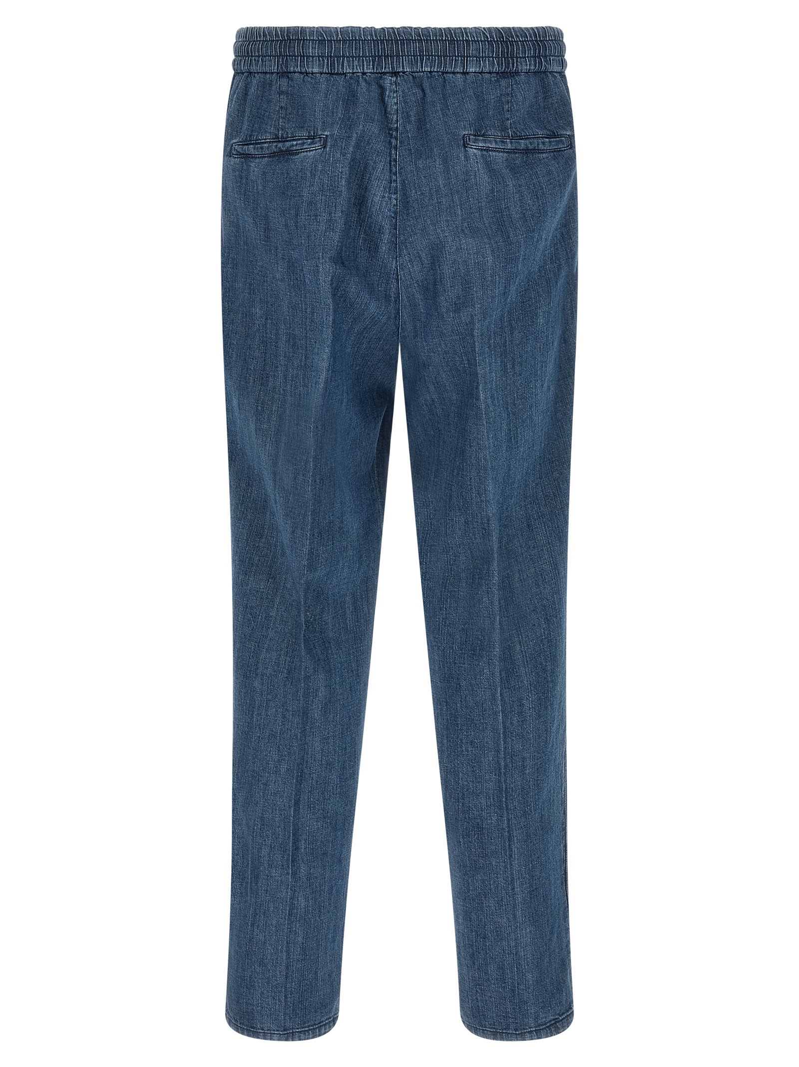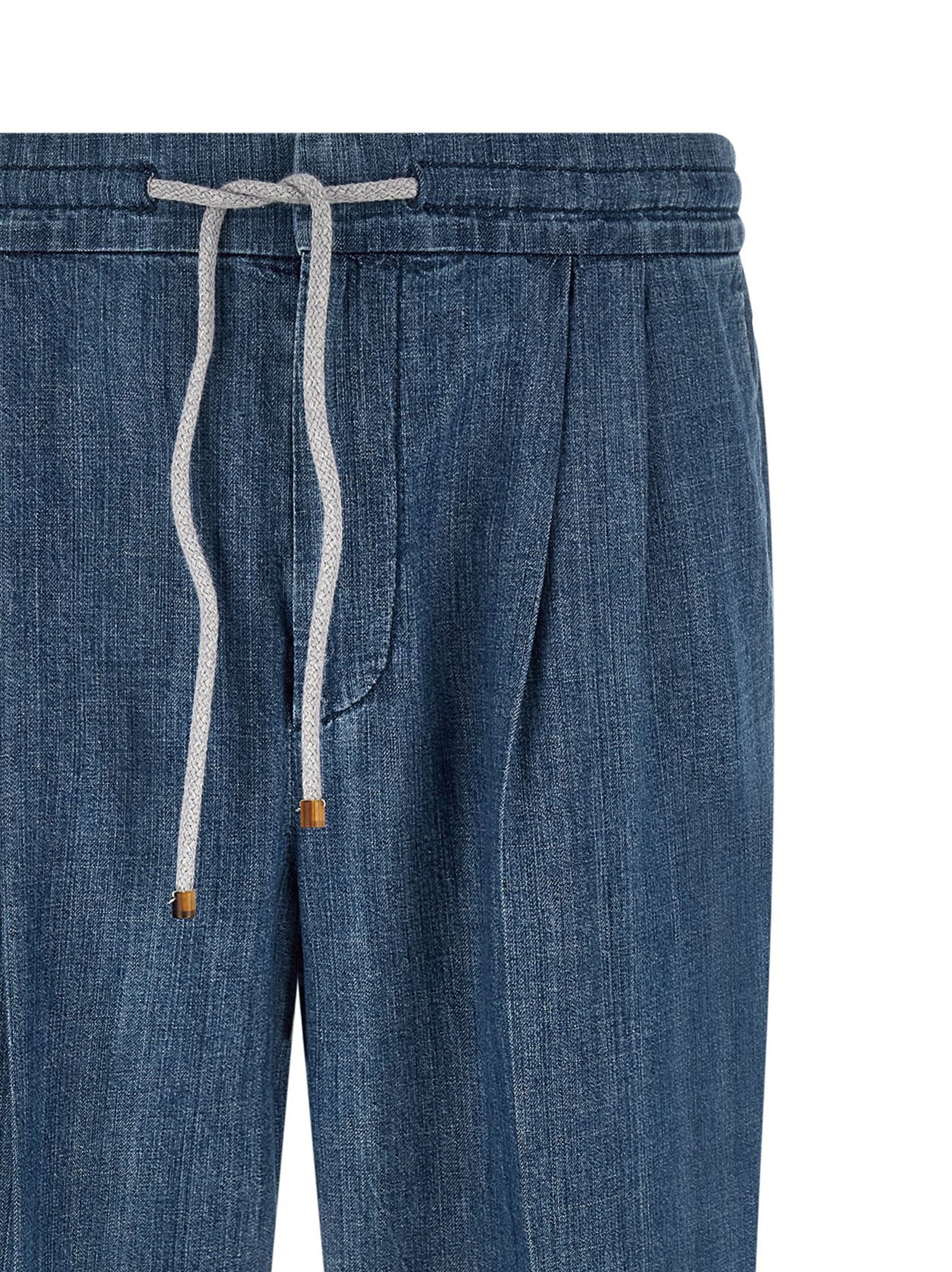 Легкие джинсы из чистого хлопкового денима с плавным силуэтом, мягким объемным кроем в области таза, слегка заниженной талией и облегающей линией штанин, двойными складками, эластичными складками, эластичным поясом на шнурке, застежкой на молнию и крючок, передними американскими карманами, задними прорезными карманами.Характеристики товара